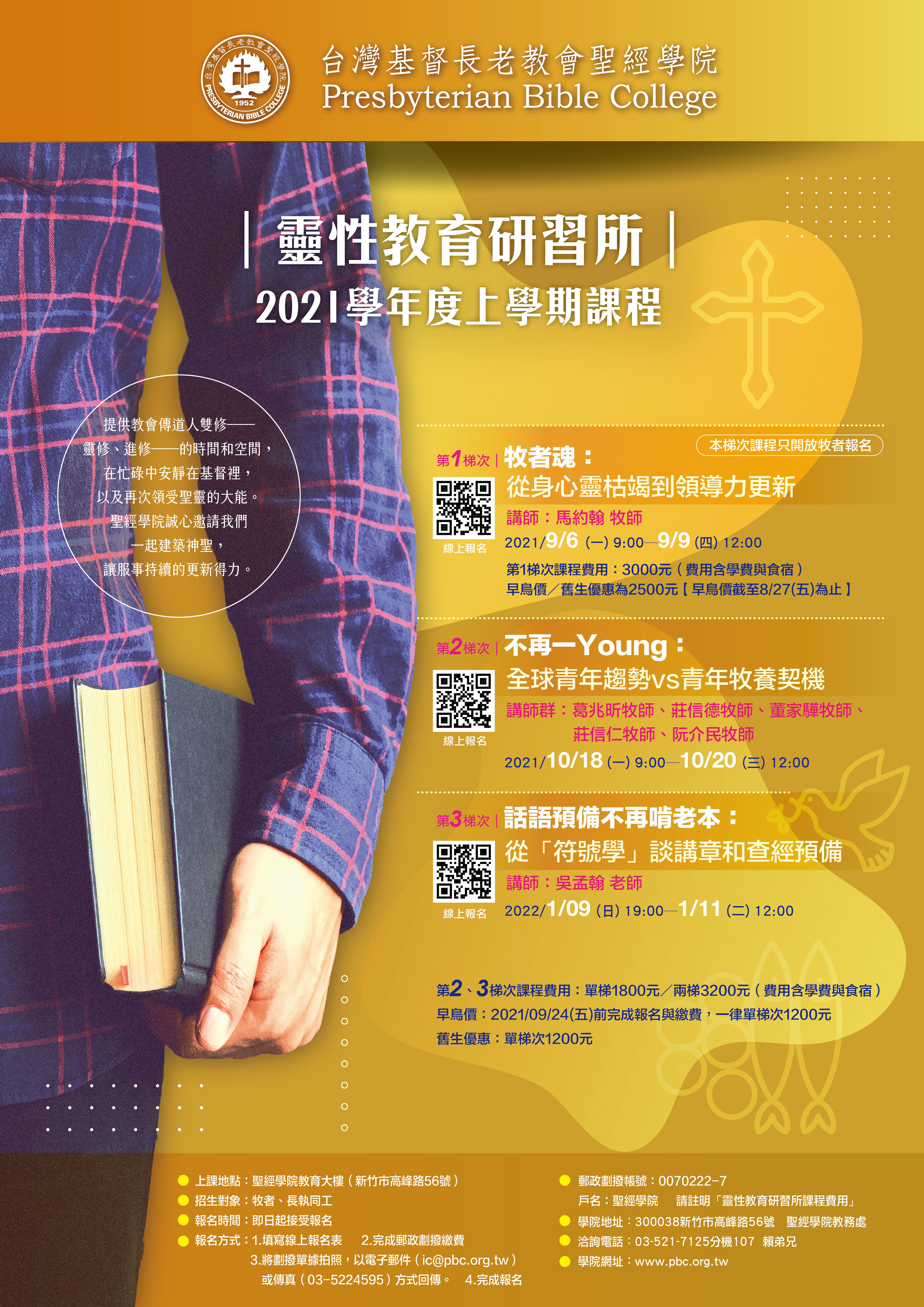 第二梯次 課程名稱:不再一Young:全球青年趨勢vs青年牧養契機 課程時間:2021年10月18日(一)上午9:00 ─ 10月20日(三)中午12:00 課程講師:葛兆昕牧師、莊信德牧師、董家驊牧師、莊信仁牧師、阮介民牧師 上課地點:聖經學院 線上報名:https://reurl.cc/XlDQbe 第三梯次 課程名稱:話語預備不再肯老本:從「符號學」談講章和查經預備 課程時間:2022年1月9日(日)下午19:00 ─ 1月11日(二)中午12:00 課程講師:吳孟翰老師 上課地點:聖經學院 線上報名:https://reurl.cc/dxzaoM 竭誠歡迎您的參與 !! 課程.jpg)