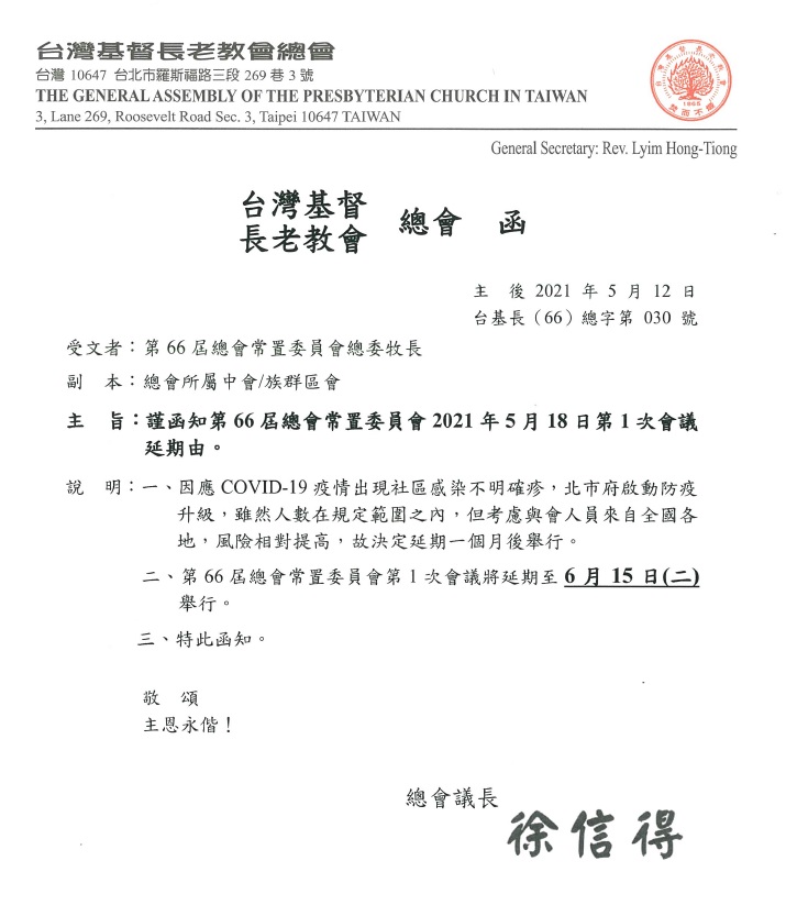 ◆總會常置委員會:5月18日(二)第66屆總會常置委員會第1次會議,延期至6月15日(二)舉行,以視訊會議方式召開。 ◆牧師、傳道師委員會:原訂5月17日(一)舉行的牧師、傳道師委員會第一次議會,因應最新疫情狀況,予以延期。 ◆NCCT 婦女小組:5月13日(四)於濟南教會舉行之研習會,延期舉行。