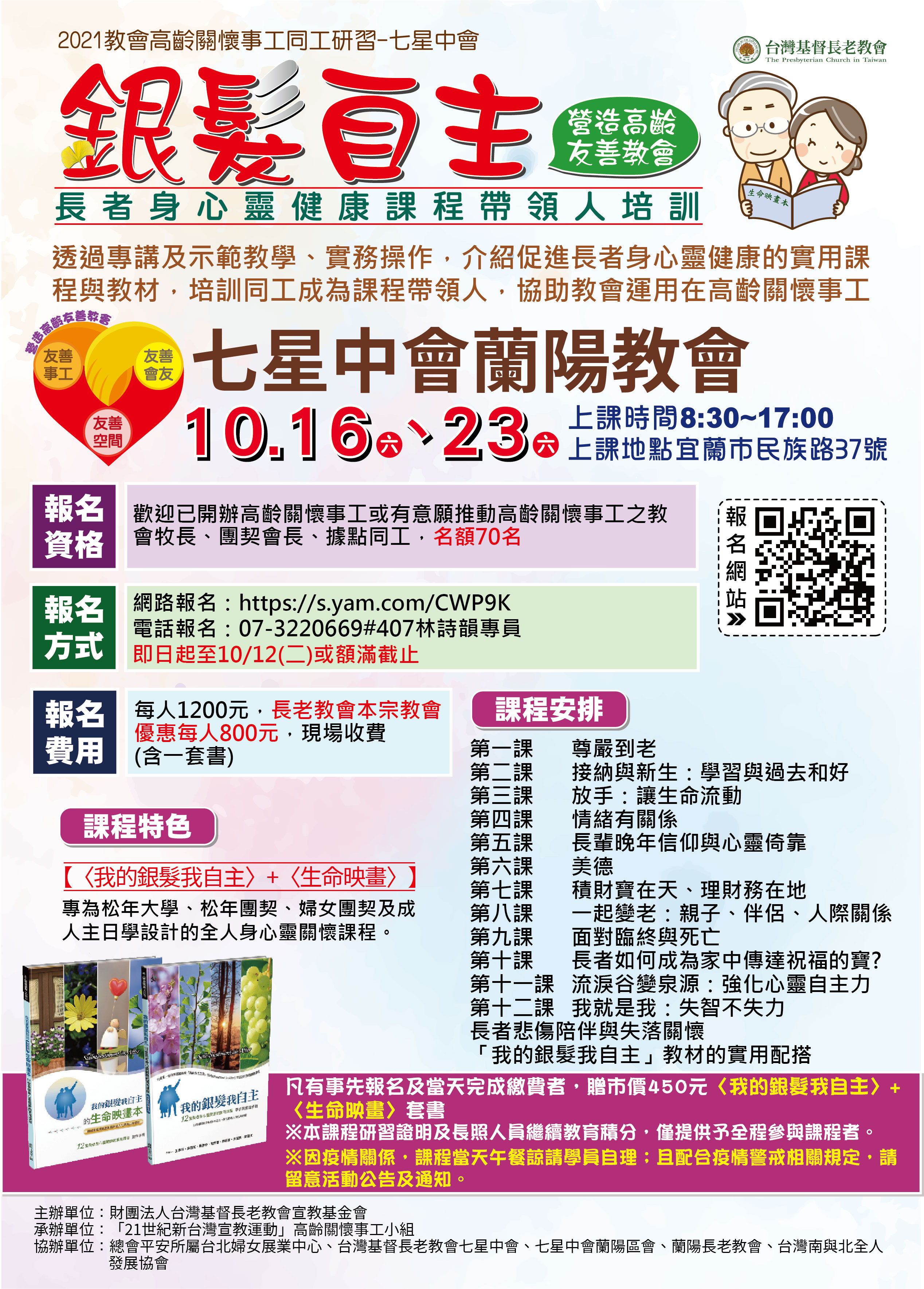 ●課程時間:10/16(六)8:30-17:00、10/23(六) 8:30-17:00 ●上課地點:七星中會蘭陽教會(宜蘭市民族路37號) ●報名資格:歡迎已開辦高齡關懷事工或有意願推動高齡關懷事工之教會牧長、團契會長、據點同工,每間教會上限五位,名額50名(視情況候補) ●報名費用:每人1200元,長老教會本宗教會優惠每人800元,現場收費(含一套書) ●報名方式:網路報名:https://s.yam.com/CWP9K 電話報名:07-3220669#407林詩韻專員 ●截止日:即日起至10/12(二)或額滿截止 ★本課程已申請長照人員繼續教育積分 ★研習證明及長照人員繼續教育積分,僅提供予當日課程全程參與者★ ★課程當天提供午餐,為配合疫情警戒相關規定,請留意活動公告及通知 主辦單位:財團法人台灣基督長老教會宣教基金會 承辦單位:「21世紀新台灣宣教運動」高齡關懷事工小組 協辦單位:總會平安所屬台北婦女展業中心、台灣基督長老教會七星中會、七星中會蘭陽區會、蘭陽教會、台灣南與北全人發展協會 |