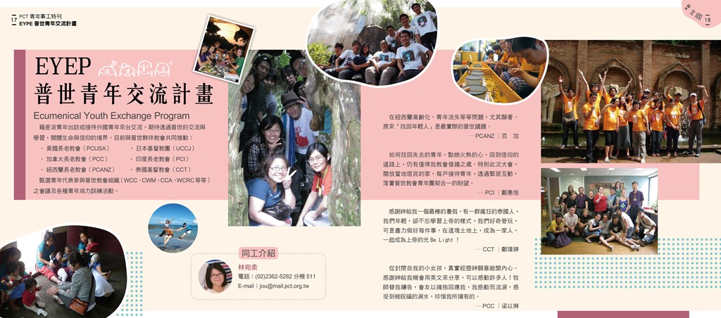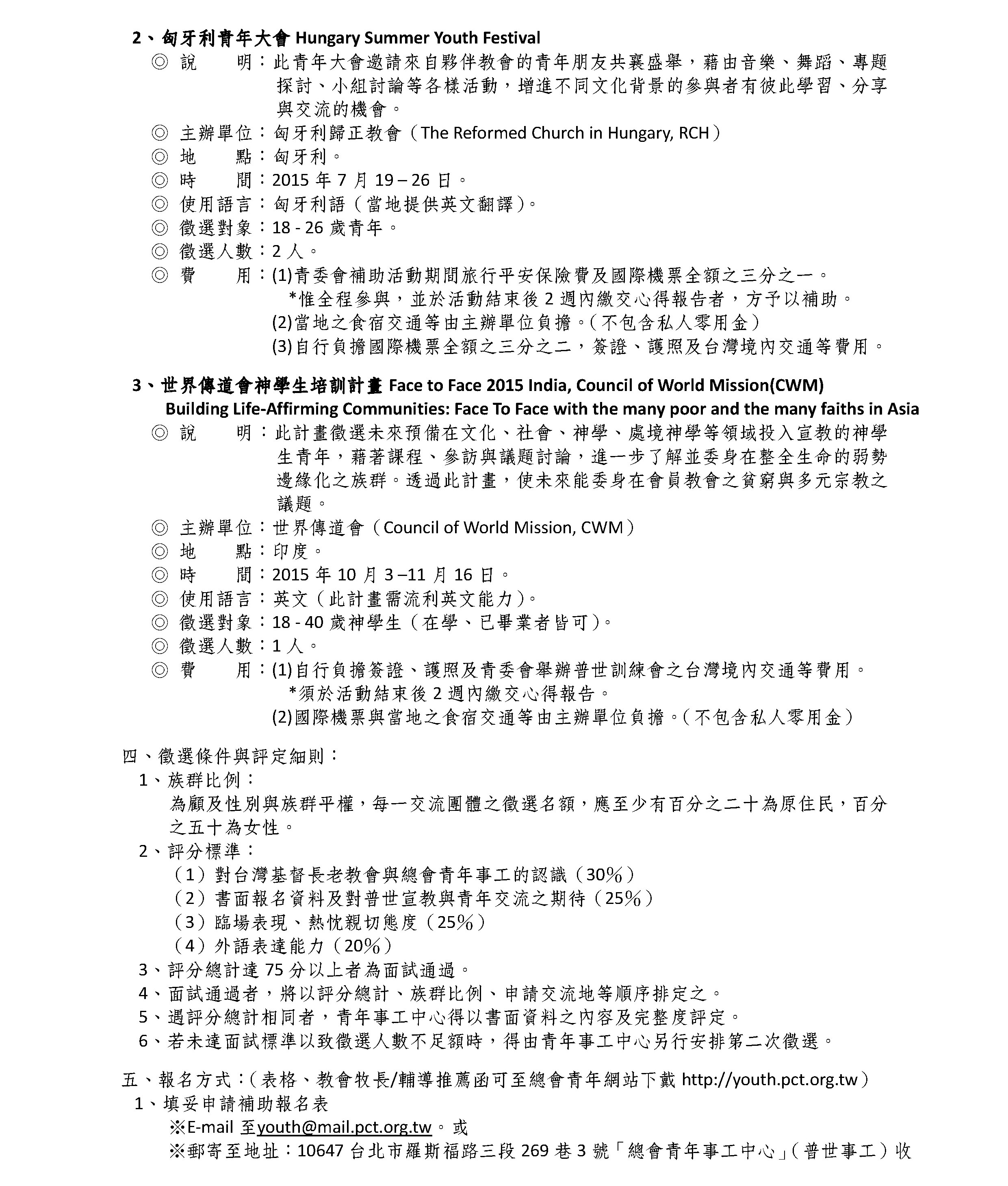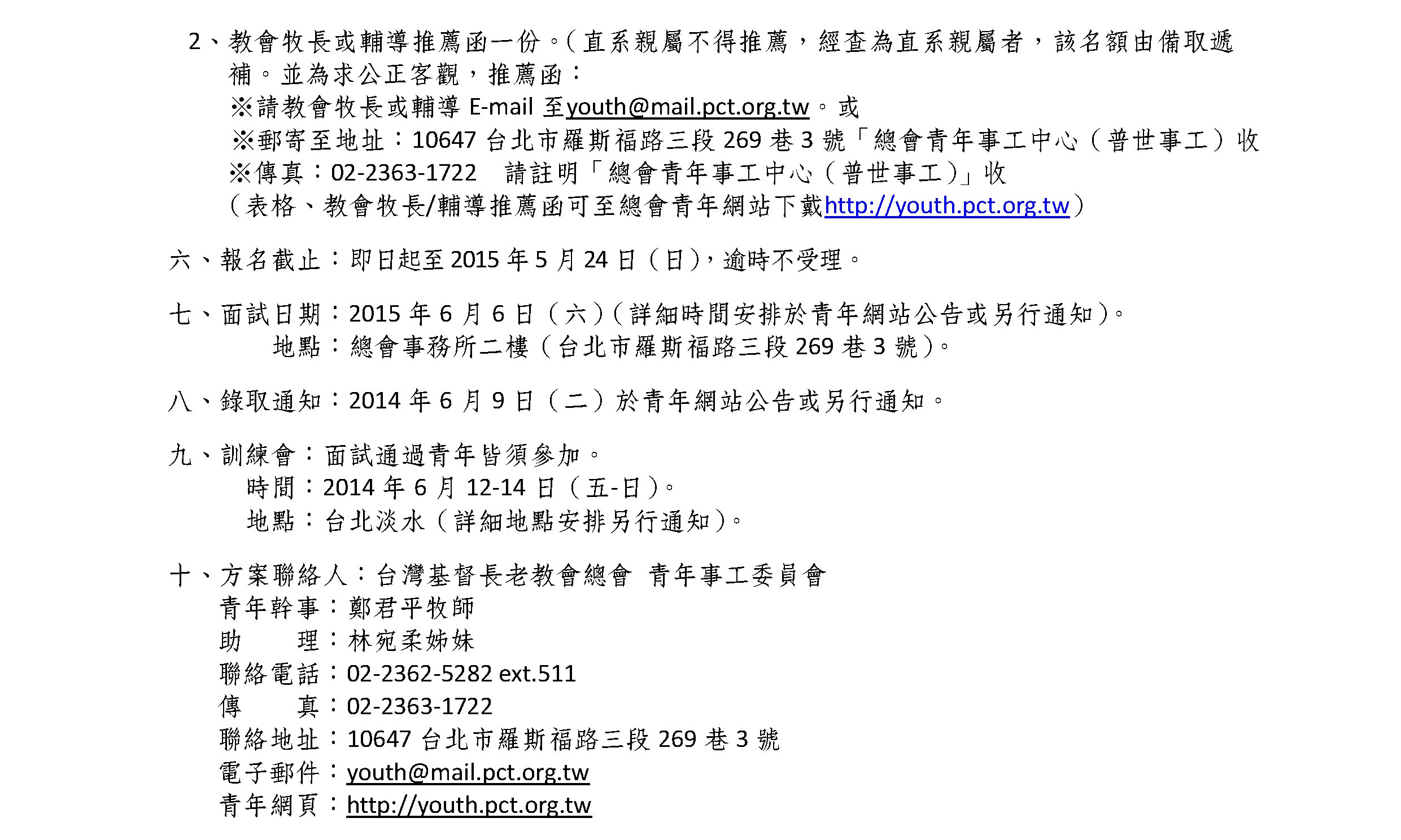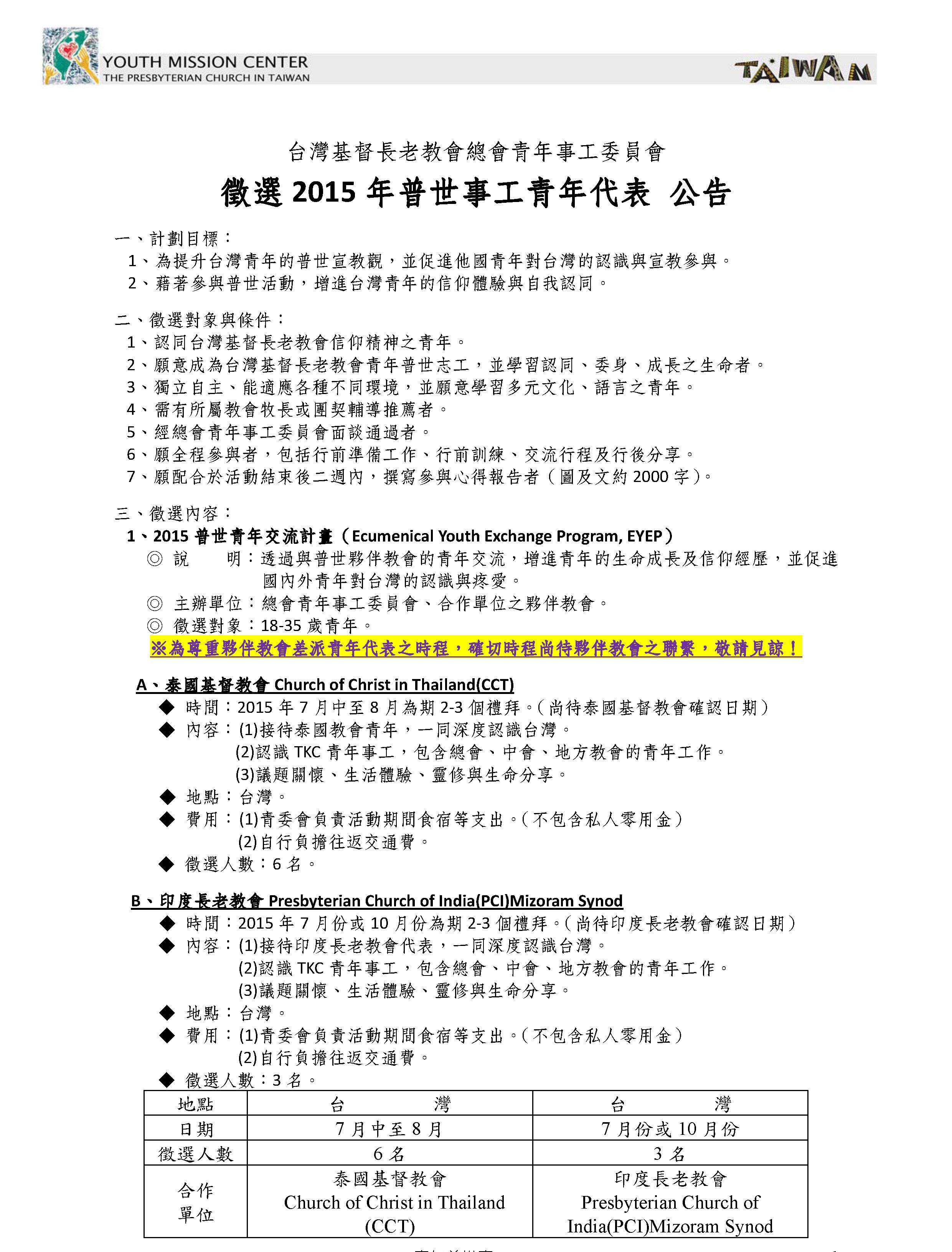 | 一、計劃目標: 1.為提升台灣青年的普世宣教觀,並促進他國青年對台灣的認識與宣教參與。 2.藉著參與普世活動,增進台灣青年的信仰體驗與自我認同。 二、徵選對象與條件: 1.認同台灣基督長老教會信仰精神之青年。 2.願意成為台灣基督長老教會青年普世志工,並學習認同、委身、成長之生命者。 3.獨立自主、能適應各種不同環境,並願意學習多元文化、語言之青年。 4.需有所屬教會牧長或團契輔導推薦者。 5.經總會青年事工委員會面談通過者。 6.願全程參與者,包括行前準備工作、行前訓練、交流行程及行後分享。 7.願配合於活動結束後二週內,撰寫參與心得報告者。 三、徵選方案:(詳細內容/時間/對象等,請詳青年網站公告) 1.2015普世青年交流計畫(Ecumenical Youth Exchange Program, EYEP) A.泰國基督教會Church of Christ in Thailand(CCT) B.印度長老教會Presbyterian Church of India(PCI)Mizoram Synod ※為尊重夥伴教會差派青年代表之時程,確切日期尚待夥伴教會之聯繫,敬請見諒! 2.匈牙利青年大會Hungary Summer Youth Festival 3.世界傳道會神學生培訓計畫Face to Face 2015 India, Council of World Mission(CWM) Building Life-Affirming Communities: Face To Face with the many poor and the many faiths in Asia 四、報名方式:(請詳青年網站公告) 1.填妥報名表 ※E-mail至youth@mail.pct.org.tw。或 ※郵寄至地址:10647台北市羅斯福路三段269巷3號「總會青年事工中心」(普世事工)收 2.教會牧長或輔導推薦函一份。(直系親屬不得推薦,經查為直系親屬者,該名額由備取遞補。並為求公正客觀,推薦函: ※請教會牧長或輔導E-mail至youth@mail.pct.org.tw。或 ※郵寄至地址:10647台北市羅斯福路三段269巷3號「總會青年事工中心」(普世事工)收 ※傳真:02-2363-1722 請註明「總會青年事工中心(普世事工)」收 (報名表格、教會牧長/輔導推薦函可至總會青年網站下戴http://youth.pct.org.tw) 五、報名截止:即日起至2015年5月24日(日),逾時不受理。 六、面試日期:2015年6月6日(六)(詳細時間安排於青年網站公告或另行通知)。 地 點:總會事務所2F(台北市羅斯福路三段269巷3號)。。 七、錄取通知:2015年6月9日(二)於青年網站公告或另行通知。 八、訓練會:面試通過青年皆參加「2015普世事工青年代表訓練會」 時 間:2015年6月12 - 14日(五-日)。 地 點:台北淡水(詳細地點安排另行通知)。 九、方案聯絡人:林宛柔姊妹 02-2362-5282 ext.511 / youth@mail.pct.org.tw |