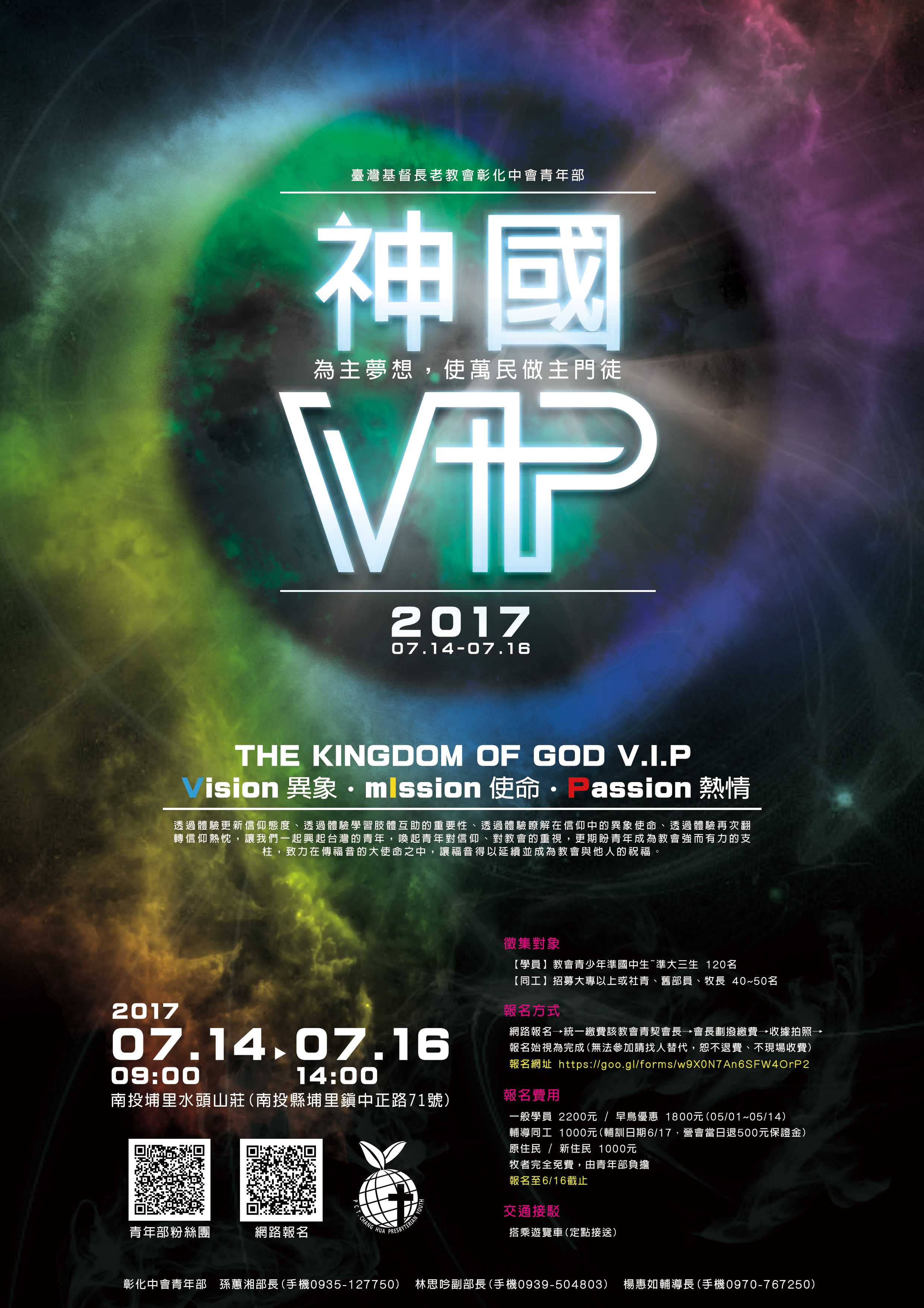 ►活動主題:神國VIP——異象Vision・使命 mIssion・熱情Passion 為主夢想,使萬民作主門徒 透過體驗更新信仰態度、透過體驗學習肢體互助的重要性、透過體驗瞭解在信仰中的異象使命、 透過體驗再次翻轉信仰熱忱,讓我們一起興起台灣的青年,喚起青年對信仰、對教會的重視,更期盼青 年成為教會強而有力的支柱,致力在傳福音的大使命之中,讓福音得以延續並成為教會與他人的祝福。 ►活動時間:2017年7月14~16日(五09:00~日14:00) ►活動地點:水頭山莊(南投縣埔里鎮中正路71號) --青年部安排遊覽車統一地點接送 ►報名對象: 【學員】教會青少年準國中生~準大三生約 120 名(分組依大會安排) 【同工】招募大專以上或社青、舊部員、牧長約 40~50 名 注意事項:(1)依同工意願及活動需要,分為活動組、輔導組、行政組 (2)務必參加6月17日(六)之營前輔導同工訓練會/專車接送 ►報名費用:一般學員每人2,200元。 輔導同工每人1,000元,營會當日退 500 元保證金。 --即日起開始報名,至6月16日(五)報名截止 --線上報名網址 https://goo.gl/forms/w9X0N7An6SFW4OrP2 ►報名方式:網路報名→統一繳費該教會青契會長→會長劃撥繳費→收據拍照→報名始視為完成 --無法參加請找人替代,恕不退費、不現場收費 --郵政劃撥帳號 : 00235200/戶名 : 彰中青年部(通訊欄註明教會、報名人數) --收據拍照傳 Line彰中青年部會計陳逸心0975828545(Line ID:joyu4vup) 請務必說明教會名稱、青契會長聯絡電話、報名總人數及金額 簡章請下載附件 ►活動聯絡人: 彰化中會青年部 部 長:孫蕙湘小姐0935127750 副部長:林思吟小姐0939504803 輔導長:楊惠如小姐 0970767250 臉書專頁:「彰化中會青年部」https://tinyurl.com/ya67q6eq |