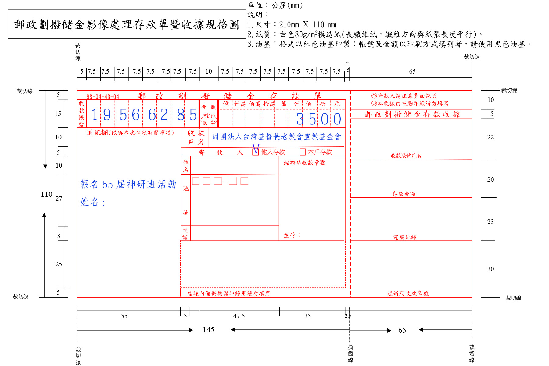 我們已在稍早以E-mail個別通知進入繳費流程的學員名單。若您沒有收到信件,敬請來信至highedu@mail.pct.org.tw 詢問,再次感謝您對第55屆大專聖經神學研究班的支持與響應。 ▼繳費流程步驟▼ ▶請至郵局使用紅色劃撥單,進行金額3500元繳費