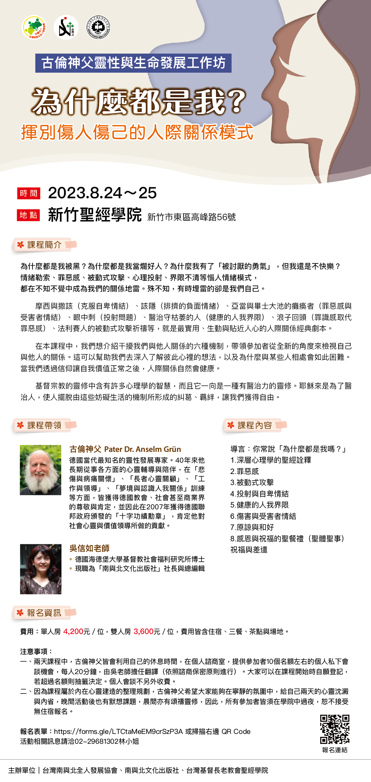 課程簡介:為什麼都是我被黑?為什麼都是我當爛好人? 為什麼我有了「被討厭的勇氣」,但我還是不快樂? 情緒勒索、罪惡感、被動式攻擊、心理投射、界限不清等惱人情緒模式, 都在不知不覺中成為我們的關係地雷。 殊不知,有時埋雷的卻是我們自己! 摩西與撒該(克服自卑情結)、該隱(排擠的負面情緒)、亞當與畢士大池的癱瘓者(罪惡感與受害者情結)、眼中刺(投射問題)、醫治守枯萎的人(健康的人我界限)、浪子回頭(罪識感取代罪惡感)、法利賽人的被動式攻擊祈禱等,就是最實用、生動與貼近人心的人際關係經典劇本。 在本課程中,我們想介紹干擾我們與他人關係的六種機制,帶領參加者從全新的角度來檢視自己與他人的關係。這可以幫助我們去深入了解彼此心裡的想法,以及為什麼與某些人相處會如此困難。當我們透過信仰讓自我價值正常之後,人際關係自然會健康。 基督宗教的靈修中含有許多心理學的智慧,而且它一向是一種有醫治力的靈修。耶穌來是為了醫治人,使人擺脫由這些妨礙生活的機制所形成的糾葛、羈絆,讓我們獲得自由。 課程帶領:古倫神父、吳信如老師 翻譯:吳信如老師(德語翻譯中文) 日期:2023年8月24日下午2:00~25日下午5:00 地點:新竹聖經學院(新竹市東區高峰路56號) 費用:單人房4,200元/位,雙人房3,600元/位,費用皆含住宿、三餐、茶點與場地。 注意事項: 一、兩天課程中,古倫神父皆會利用自己的休息時間,在個人諮商室,提供參加者10個名額左右的個人私下會談機會,每人20分鐘,由吳老師擔任翻譯(依照諮商保密原則進行)。大家可以在課程開始時自願登記,若超過名額則抽籤決定。個人會談不另外收費。 二、因為課程屬於內在心靈建造的整理規劃,古倫神父希望大家能夠在寧靜的氛圍中,給自己兩天的心靈沉澱與內省,晚間活動後也有默想課題,晨間亦有頌禱靈修,因此,所有參加者皆須在學院中過夜,恕不接受無住宿報名。 報名表單:https://forms.gle/LTCtaMeEM9crSzP3A 活動相關訊息請洽02-29681302林小姐 主辦單位|台灣南與北全人發展協會、南與北文化出版社、台灣基督長老教會聖經學院