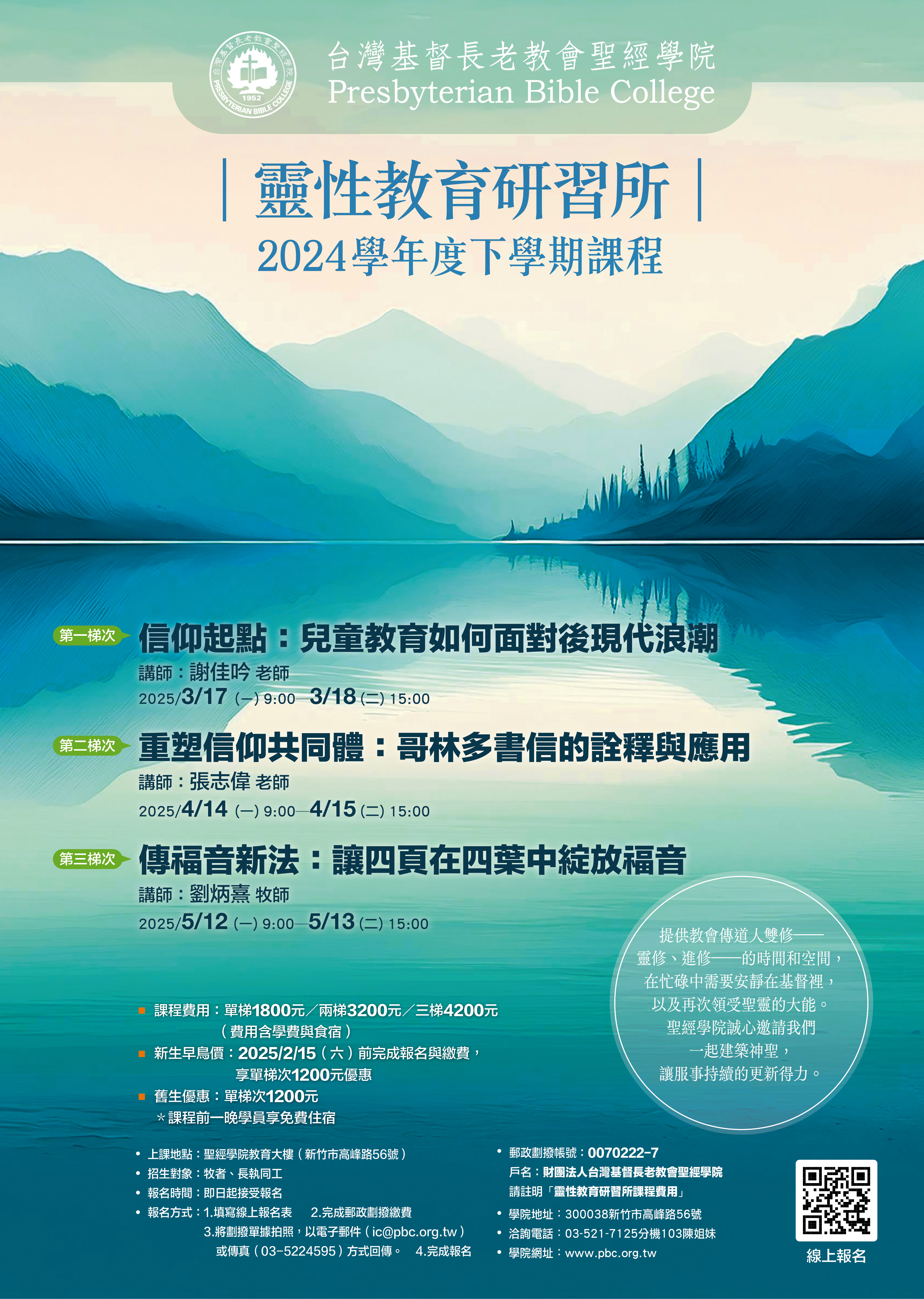 提供教會傳道人雙修──靈修、進修──的時間和空間,在忙碌中安靜在基督裡,以及再次領受聖靈的大能。聖經學院誠心邀請您一起建築神聖,讓服事持續的更新得力。 一、課程時間 第一梯次 信仰起點:兒童教育如何面對後現代浪潮 講師:謝佳吟老師 時間:2025/3/17(一)09:00-3/18(二)15:00 第二梯次 重塑信仰共同體:哥林多書信的詮釋與應用 講師:張志偉老師 時間:2025/4/14(一)09:00-4/15(二)15:00 第三梯次 傳福音新法:讓四頁在四葉中綻放福音 講師:劉炳熹牧師 時間:2025/5/12(一)09:00-5/13(二)15:00 二、上課地點 聖經學院教育大樓(新竹市高峰路56號) 三、招生對象 牧者、長執同工 四、課程費用 ※課程前一晚學員享免費住宿 課程費用:單梯1800元/兩梯3200元/三梯4200元(費用含學費與食宿) 新生早鳥價:2025/2/15(六)前完成報名與繳費,享單梯次1200元優惠 舊生優惠:單梯次1200元 報名網址:https://docs.google.com/forms/d/e/1FAIpQLSeN8PDvSuzLjRPgwaDPBB9UqDZSajrE8duYbrKD9qU_LJ39ww/viewform 竭誠歡迎您的參與!! 聖經學院教務處 敬上