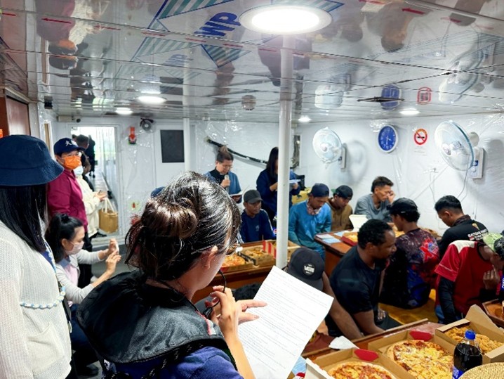 【跨越語言的祝福】 將每一位異鄉船員的安全交託上帝,讓平安隨船啟航 最近的港口特別忙碌,因為一艘圍網漁船即將出港。甲板上,一群跨越國界、為了夢想與家庭奮鬥的船員們正穿梭不停。他們馬不停蹄地檢視每一項補給、細心修補每一寸漁網,確保所有漁具與機械都在最佳狀態,在緊湊的節奏中,每個專注的眼神與動作,都是為了在即將展開的漫長海上歲月中,能有最萬全的準備。 遠洋漁業從來不是一份輕鬆的工作,而是一場與大海的馬拉松。在遠離陸地的深海,日夜交替失去了常規,風浪的變幻莫測與嚴峻的氣候條件,時刻都在挑戰著船員們的體力與心志極限。這群異鄉夥伴不僅要面對繁重的勞動,更要克服對家鄉的思念與孤獨。 為了給予這群海上勇士最堅實的心理支撐,出港作業前夕,海員/漁民中心陳武璋牧師受邀為船員祈福禱告,祈求天父看顧這艘船及每一位在船上的人。無論是在風平浪靜或驚濤駭浪的日子都引導他們安全向前行。也願這艘船上的勞動是誠實正直的,並帶來糧食及生活所需,願上帝保守船員不遭遇危險,並在航行中賜下智慧。 另外,船東特別準備了餐點,邀請船員與夥伴們一起用餐同樂。在忙碌與緊繃之中,這短暫的相聚成了一段難得的放鬆時光。簡單的一餐,卻盛著關心與祝福,也拉近了彼此的距離。