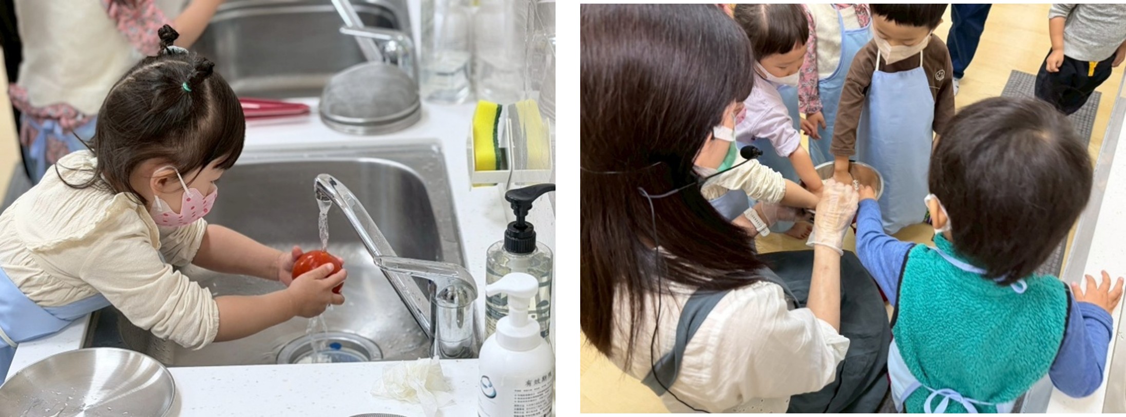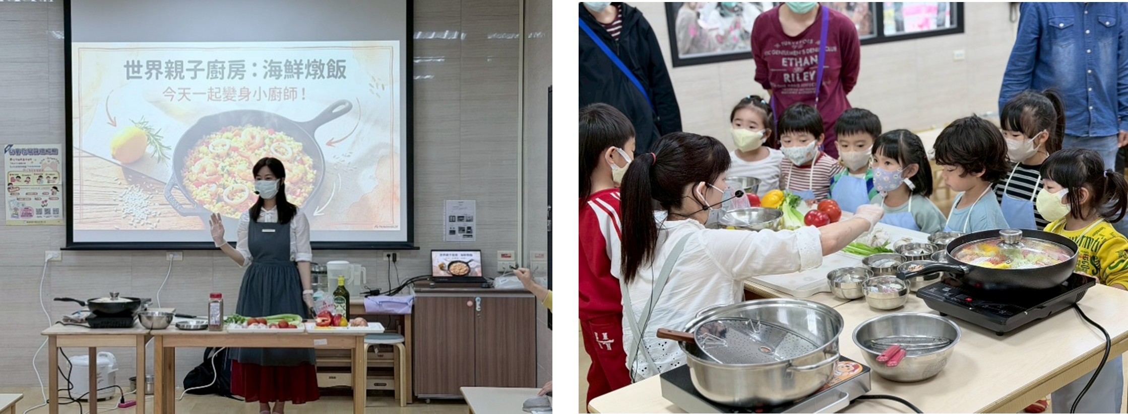 孩子們繫上小圍裙,興奮地投入準備工作。香香老師親切又細心的示範下,從洗米、洗菜開始,到認識各式海鮮與香草食材、動手備料,每一個步驟都由親子攜手完成。當鍋中傳來陣陣香氣,淡淡的香料氣息瀰漫整個空間,孩子們專注看著香香老師料理時的神情與家長溫柔陪伴的孩子目光,都讓親子廚房成為最動人的學習場域。