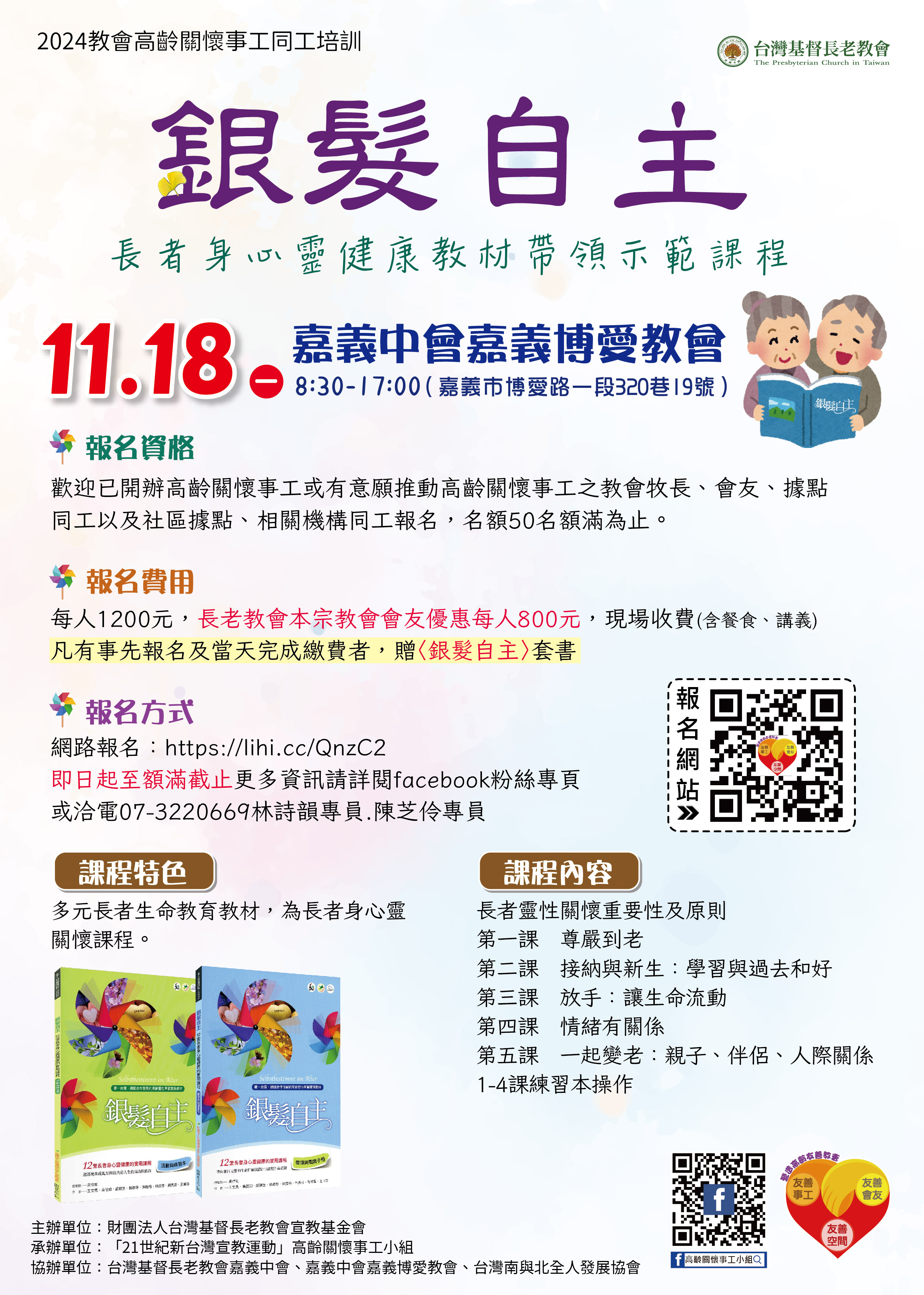●報名費用:每人1200元,長老教會本宗教會會友優惠每人800元,現場收費(含餐食、講義)凡有事先報名及當天完成繳費者,贈〈銀髮自主〉套書