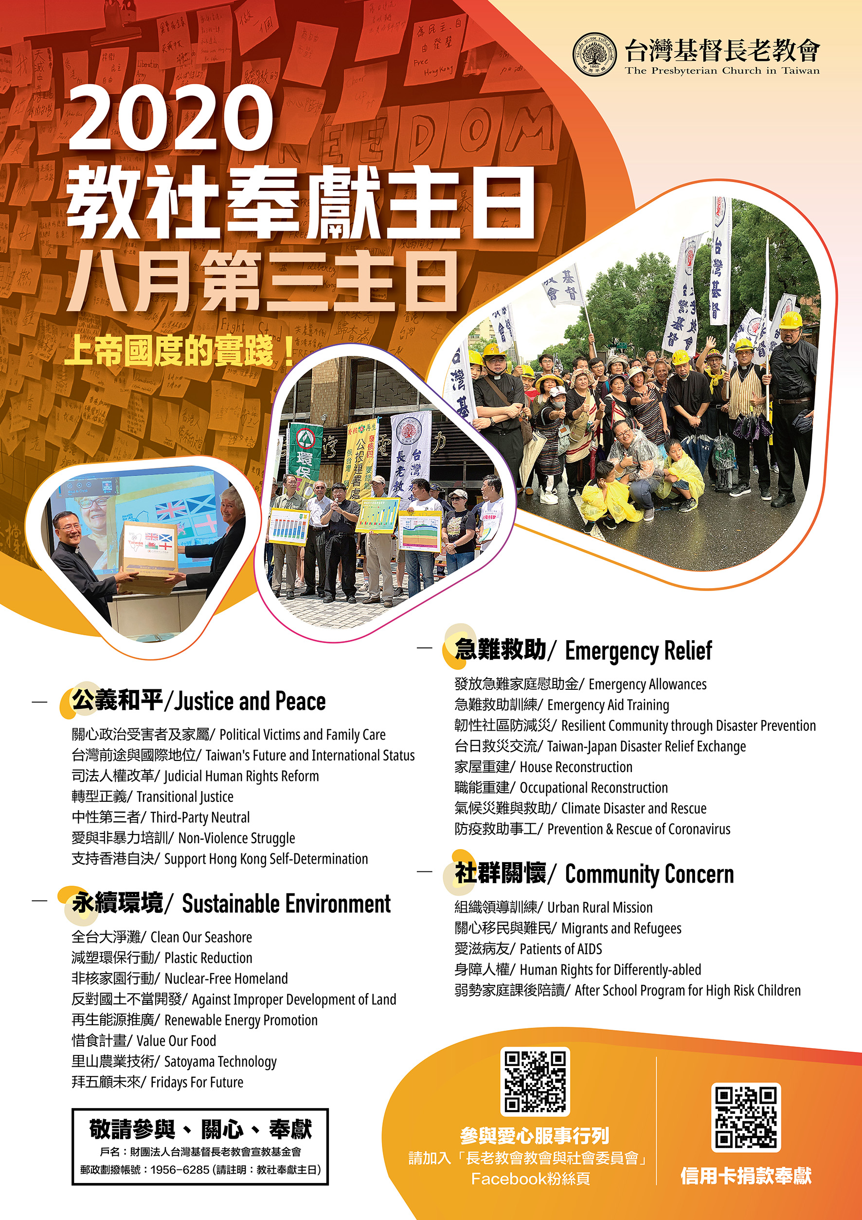 敬請各教會牧長、信徒關心8月16日(8月第三主日)今年度「教社奉獻主日」並為我教會教社事工代禱及奉獻。