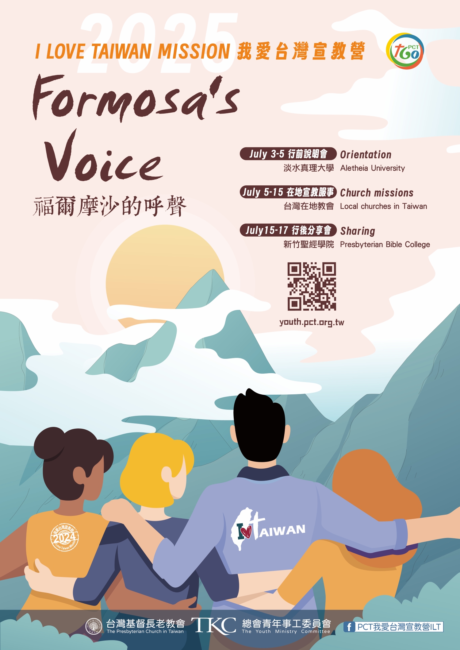 2025年我愛台灣宣教營 I Love Taiwan Mission福爾摩沙的呼聲 Formosa's Voice 回顧台灣基督長老教會160年的宣教足跡,無論是1865年由蘇格蘭來到台灣的馬雅各醫生(James Laidlaw Maxwell),1872年來自加拿大的馬偕牧師(Rev. Dr. George Leslie MacKay)等許多來自世界各地的宣教師,以及高俊明牧師、謝緯牧師等無數本地基督徒,跟隨耶穌基督,以生命回應上主發出的「福爾摩沙的呼聲 Formosa's Voice」,使得長老教會在台灣土地上宣揚福音,如同《台灣基督長老教會信仰告白》(台語漢字):「通過疼與受苦,成為盼望的記號」。 2025年「我愛台灣宣教營 ILT」向年輕朋友們發出「福爾摩沙的呼聲 Formosa's Voice」,讓我們一起在台灣各地教會學習、服事與訪問,領受與經歷上帝豐盛的愛和恩典。期盼國內外青年在「我愛台灣宣教營 ILT」的參與與服事,體驗台灣之美,更加認識和疼惜台灣,開闊普世視野,彼此鼓勵和成長。 歡迎各教會申請參加「我愛台灣宣教營 ILT」專案,在地教會可透過接待外國青年的服事,使會友和年輕人有普世交流、合作與服事,這是寶貴的經驗與學習機會。 願上主賜福帶領,國內外的青年和眾教會在2025年「我愛台灣宣教營 ILT」,見證台灣基督長老教會160年的宣教足跡,上主在台灣所行的奇妙工作。同時激勵年輕人的信仰,對上帝、自己以及台灣與世界有更深認識,聆聽上主對青年與眾教會的生命呼召,回應上主在這個時代「福爾摩沙的呼聲 Formosa's Voice」。