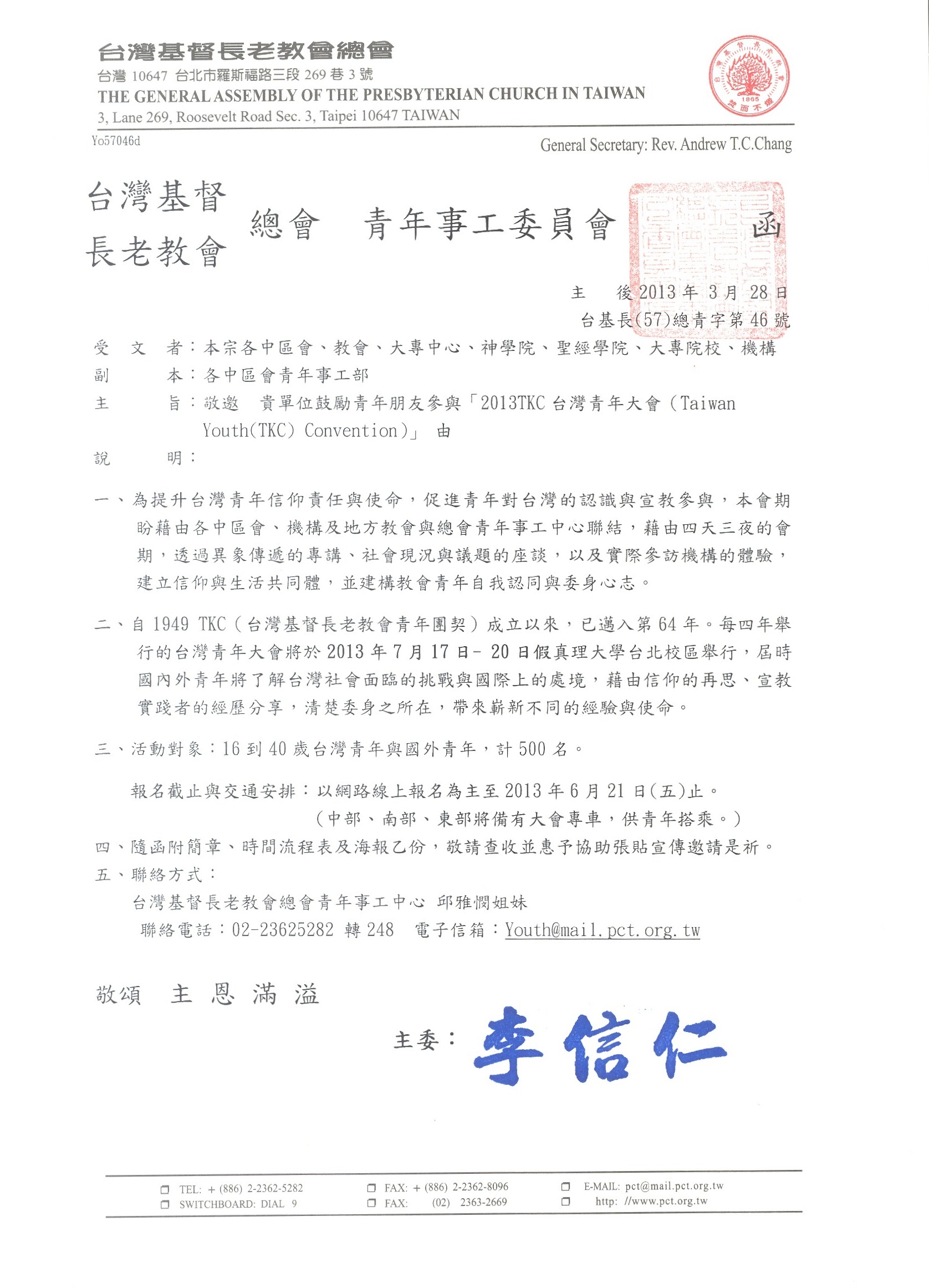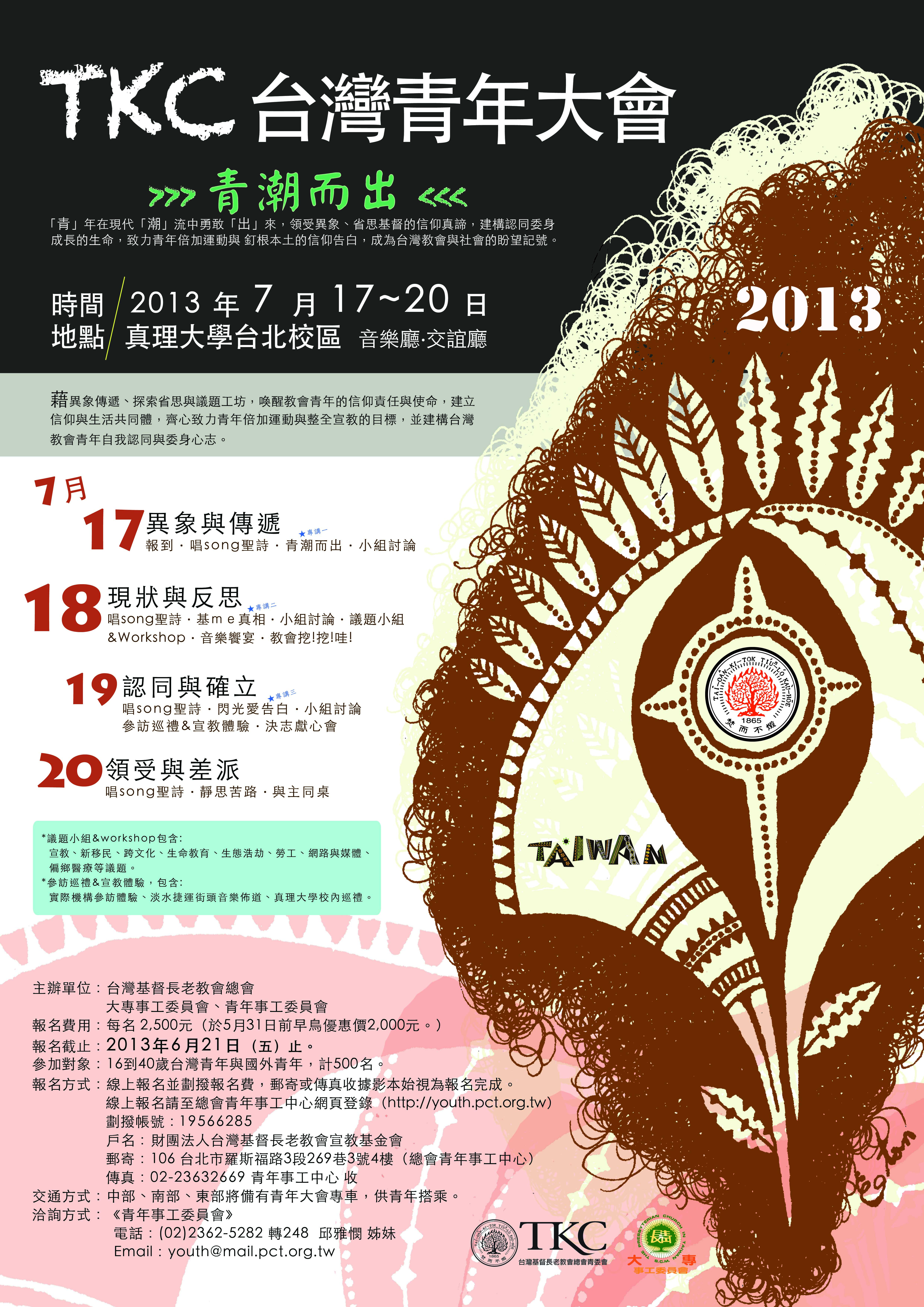 每一天早晨,將有不同族群的青年敬拜團,用美麗的樂聲為主開唱。 每一個議題workshop,將滿足青年探索台灣新住民教育、生命教育、生態浩劫…的求知慾望。 每一次的探訪,將實地帶領青年走訪本土,體驗宣教士們留在台灣的時代記憶。 一場『教會挖!挖!哇!』現場live秀,五位牧長將與青年面對面暢談基督; 一場由929樂團吳志寧、農村武裝青年阿達的音樂饗宴,將一起用音符去關懷社會各角落; 一場永無止盡的苦路馬拉松,正期待著勇士們去征戰; 一座厚重的十字架,正等待著強壯的肩膀去承受; 還在等什麼?找回自己,也給予自己重新審思基督的勇氣! 還在猶豫什麼?沉澱自己,也找回自己今生價值的力量! ------------------------------------------------------------------------------------------------------------------------- 一、活動宗旨:藉異象傳遞、探索省思與議題工坊,喚醒教會青年的信仰責任與使命,建立信仰與生活共同體,齊心致力青年倍加運動與整全宣教的目標,並建構台灣教會青年自我認同與委身心志。 二、主辦單位:台灣基督長老教會總會青年事工委員會、大專事工委員會。 三、舉辦時間:2013年7月17日(三)~7月20日(六)。 四、舉辦地點:真理大學台北校區 音樂廳﹠交誼廳。 (中部、南部、東部將備有專車供青年搭乘,請洽各中會青年部長或大專中心。) 五、主 題:《青潮而出》「青」年在現代「潮」流中勇敢「出」來,領受異象、省思基督的信仰真諦, 建構認同委身成長的生命,致力青年倍加運動與釘根本土的信仰告白,成為台灣教會與社會的盼望記號。 六、報名費用:每名2,500元整(於6月15日前早鳥優惠價2,000元,含膳宿、保險、講師) 。 七、網路報名截止:2013年6月21日中午12:00 八、活動對象:16到40歲台灣青年與國外青年,限額500名。 九、報名方式: (A) 步驟一:線上報名: 登入報名系統(http://acts.pct.org.tw/djactive/ActList.aspx)。 (B) 步驟二:劃撥報名費。 | 匯款行庫 | 帳號 | 戶名 | | 郵政劃撥 | 19566285 | 財團法人台灣基督長老教會宣教基會 | | 通訊欄 | 必註明教會、姓名、「2013TKC青年大會」收 | (C) 步驟三:郵寄或傳真劃撥收據影本或填寫繳費資訊。(三擇一) (D)步驟四:來電確認,電話02-23625282轉248。 ※線上報名→劃撥報名費→郵寄或傳真或填寫繳費資訊→來電確認→完成報名手續。 九、洽詢方式:《台灣基督長老教會總會 青年事工委員會》 電話:(02)2362-5282 轉248邱雅憫 姊妹 Email:youth@mail.pct.org.tw 網址:http://youth.pct.org.tw 臉書: http://www.facebook.com/YouthShangQing