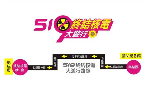 遊行日期:5月19日,14:00(開始)~18:00(結束)。 | 活動時間 | 活動地點 | 遊行路線 | | ♦遊行:14:00集合,15:00出發,17:00到達凱道。 ♦晚會:18:00~22:00 | ♦國父紀念館(集合) ♦凱達格蘭大道 | 國父紀念館→仁愛路→光復南路→忠孝東路→新生南路→仁愛路→抵達凱達格蘭大道。 | 2.誠摯邀請 各教會牧長鼓勵信徒參加5月19日之終結核電遊行,實踐「關懷受造界」之信仰。 3.教社委員會補助大台北地區外之當日遊覽車車資(每輛以坐滿30人以上為原則)及一餐之便當費用。 (收據統編:17611011;抬頭:財團法人台灣基督長老教會宣教基金會) 4.請於5月15日前向各中區會之教社部報名,以利教社委員會之行政運作。 5.紙本公函資料如附檔,活動相關之最新消息可至Facebook搜尋「台灣反核行動聯盟」。 https://www.facebook.com/TW.NONUKE?ref=stream。 6.若有任何問題請聯絡:02-23625282 傳真:02-2363-2669 負責幹事黃哲彥牧師 分機258或助理劉嘉芬姐妹、黃熾紅姊妹分機450、359。 E-Mail:society@mail.pct.org.tw |