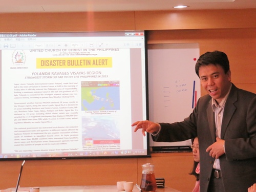 ↑台灣基督長老教會總會教社幹事林偉聯牧師報告 台灣基督長老教會總會教社幹事林偉聯牧師表示,長老教會總會(PCT)和菲律賓的聯合教會(UCCP)訂有宣教協議,任何宣教行動或救災必須透過UCCP才能進行。當PCT透過國際新聞得到消息,第一時間就寄請安函,並提撥1萬美金給UCCP。林偉聯牧師說,當時長老教會所屬的三家醫院的國際醫療團已待命,也組織好國際志工隊,隨時準備出發到菲律賓,但可能是UCCP負責救災的窗口太忙,PCT一直未收到進一步回應,故無法派員。 林偉聯牧師報告說,到目前為止,長老教會已收到1百餘萬的奉獻款。PCT還是會繼續透過普世事工委員會與UCCP聯繫,若有機會參與第二階段的重建工作,長老教會再進一步提出實質的協助。