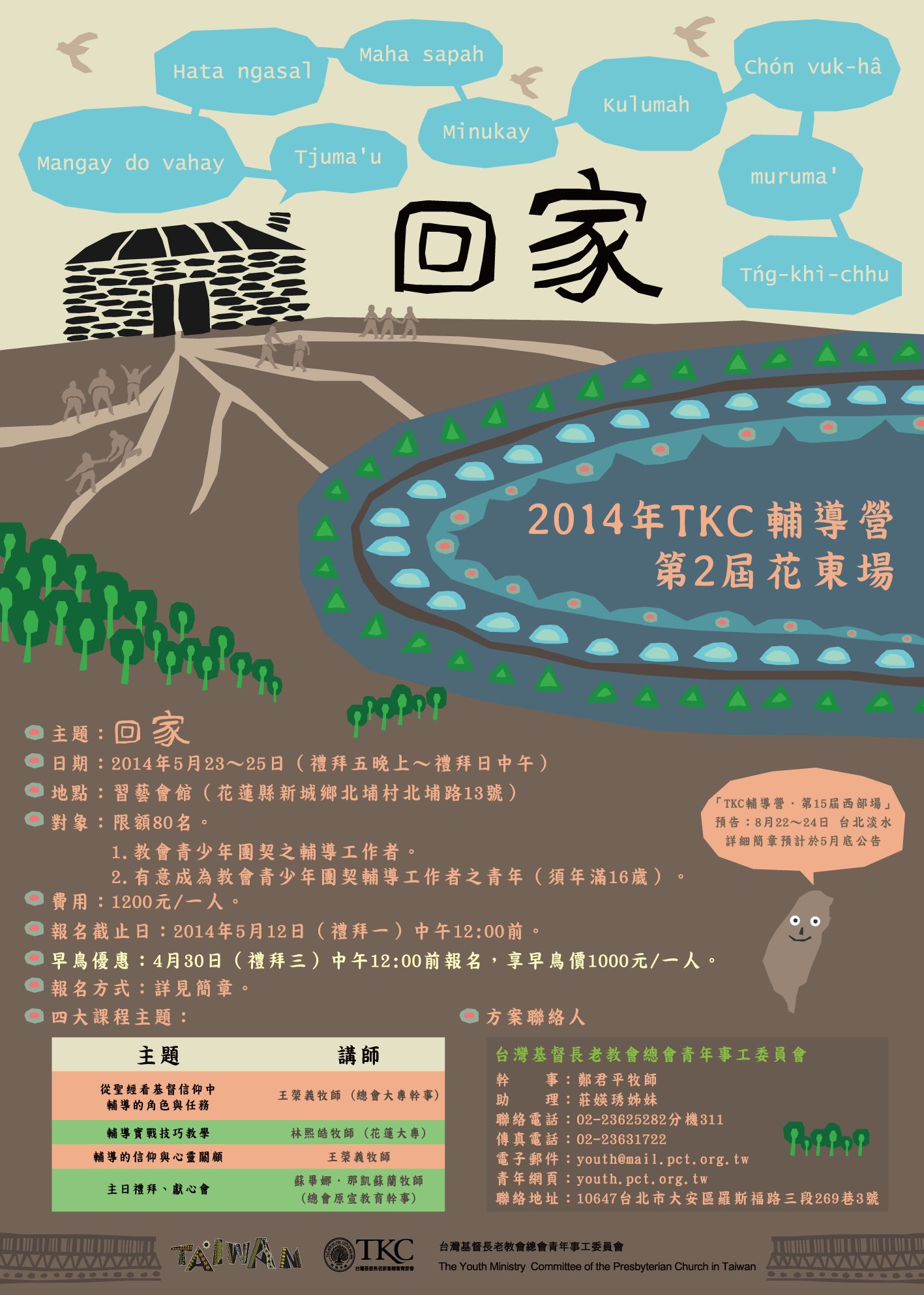 ►日期:2014年5月23~25日(五晚上~日中午) ►地點:習藝會館(花蓮縣新城鄉北埔村北埔路13號) ►主辦單位:台灣基督長老教會總會青年事工委員會 ►對象:限額80名。 (1)教會青少年團契輔導。 (2)預備成為教會青少年團契輔導之青年(須年滿16歲)。 ►費用:1200元 / 人。 ►報名截止日:2014年5月12日(禮拜一)中午12:00前。 ►早鳥優惠:4月30日(禮拜三)中午12:00前報名,享早鳥價1000元/人。 ► 為鼓勵〈原住民教會青年〉報名參加,原住民屬下中區會教會青年報名者, 原住民宣教委員會提供報名費半價補助,請踴躍參加。(詳如 附件3:原宣公函) ►報名方式: (2)完成線上報名後,至郵局「劃撥」報名費, 並請務必於通訊欄註明「TKC輔導營報名費、學員姓名」。 郵政劃撥帳號:19566285/戶名:財團法人台灣基督長老教會宣教基金會。 (3)將劃撥收據「傳真」或「拍照E-mail」至總會,並於空白處註明「TKC輔導營報名費、學員姓名」。 (4)為避免漏信,請於傳真或E-mai後「來電確認」。 ►講師介紹: | 專題 | 講師 | | 從聖經看基督信仰中輔導的角色與任務 | 王榮義牧師(總會大專幹事) | | 輔導實戰技巧教學 | 林熙皓牧師(花蓮大專學生中心主任) | | 青少年兩性教育輔導 | 蘇畢娜.那凱蘇蘭牧師(總會原宣教育幹事) | | 聖詩在團契中的使用 | 哈尤.尤道牧師(太魯閣中會砂卡礑教會牧師) | | 輔導的信仰與心靈關顧 | 王榮義牧師(總會大專幹事) | | 主日禮拜、獻心會 | 蘇畢娜.那凱蘇蘭牧師(總會原宣教育幹事) | ►活動內容與流程表:詳如附件1:簡章「第2頁:營會流程與課程講師介紹」。 ►交通方式:詳如附件1:簡章「第3頁:營會交通建議」。 ►方案聯絡人: 台灣基督長老教會總會青年事工委員會 青年幹事:鄭君平牧師 事工助理:莊媖琇姊妹(輔導培訓) 聯絡電話:02-23625282分機311 傳真電話:02-23631722 電子郵件:youth@mail.pct.org.tw 聯絡地址:10647台北市羅斯福路三段269巷3號 |