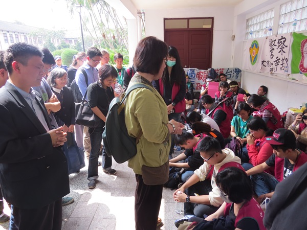 太陽花學運第九天。3月26日下午一點半,在長老教會高雄中會議長丁尊貴牧師的陪同下,全國禱告網絡總幹事潘劉玉霞牧師率牧者同工前來探望學生,包括靈糧堂、信義會、台北新恩堂等10多位牧師。剛好當天中午,立法院議場外走廊是台南神學院的神學生在第一道防線駐守靜坐。 台灣基督長老教會教社幹事林偉聯牧師代表總會歡迎牧者前來,並告知連日來也有多位靈糧堂、召會...的基督徒參加靜坐,他們如同羊沒有牧人一樣,的確很需要牧者前來關心及遮蓋。 潘劉玉霞牧師說,此次前來,希望不只是從媒體上得到消息,而是能真正知道學生們守護民主的心,同樣都是愛台灣這塊土地。她希望不公義的聲音不只是要讓社會聽到,也要讓眾教會聽到。 在禱告時,潘劉玉霞牧師特別為長老教會獻上感謝。她說,因為上帝將長子的名份給長老教會,而能夠聽得見、看得見,也能走出一條路來。她也懇求主除去一切不公義、不聖潔、不合神心意的作法。求主在這些事上掌權,安慰這些年輕人,相信學生們呼求的聲音會達到神的面前。她也希望透過這件事,能讓眾教會彼此同心合一,並願意為這塊土地禱告,獻上生命。 禱告完,林偉聯牧師隨即向前來探訪的牧者作見證。林牧師說,參與靜坐的學生和群眾,並沒有帶食物和水,但這幾天卻像摩西一樣,經歷到從天上掉下來嗎哪和鵪鶉的恩典,他們還曾經吃過炸雞排和冰棒。「根本不用擔心吃的。光一個早上都可收到300個宅急便寄來的包裹,收件人都是反服貿的群眾」。 另外,林偉聯牧師也向牧者說明服貿對教會的影響。他說,「不要以為服貿會帶來教會的宣教契機。雖然兩國往來,人員流動會很頻繁,但信徒也會跑掉。」林牧師分析,或許教會能夠增加許多中國的慕道友,可以達成傳福音的目的;但原本在台灣能夠賺錢、優質的人力也會流往中國,教會的奉獻也會相對減少,對於教會的運作、信徒的安全及管理也會產生許多問題。林牧師認為,教會的牧者和神學生都應該好好思考這個問題,才能夠明白神的啟示是什麼。他也向呼籲眾教會也能一起加入反服貿的行列。 最後,林偉聯牧師邀請參訪的牧者說:「歡迎你們教會將弟兄姊妹帶來,我們在這裡主日的時候,照常主日禮拜,晨更、晚禱、唱詩歌、讀聖經,在這裡為主做見證,歡迎大家一起來經歷主的恩典。」 |