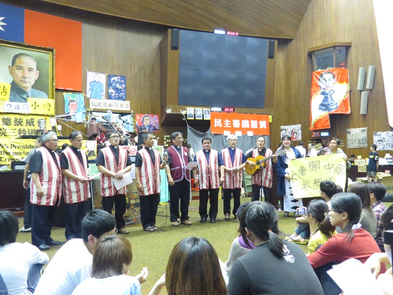 3月27日下午四點,從花蓮遠道而來,太魯閣中會議長洛金‧基佑和牧者們組成牧聲合唱團,在議場內獻唱詩歌<台灣就是我們的母親>、<福爾摩沙>等曲目,鼓勵學生一定要堅強,堅持下去。