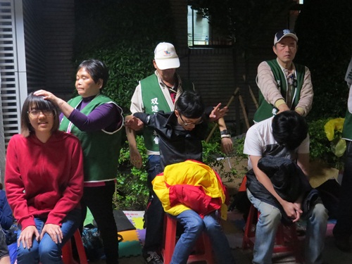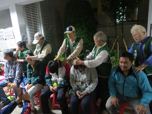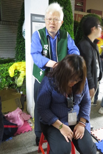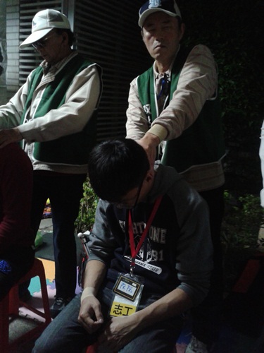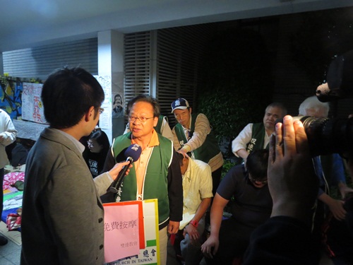 前天下午,雙連教會西羅亞詩班到議場內為學生按摩,4月2日晚上8時許,雙連教會的盲朋友再度到議場外的學生靜坐區,為外場的學生志工免費按摩。負責帶隊的李汪政長老表示,這些盲朋友體會到學生們這幾天的辛苦,他們認為這些學生跟他們一樣都是弱勢,因此特別到立法院來為學生加油、打氣。其實晚上正是盲朋友們上工最忙的時候,但是為了學生,他們願意擺上。 李汪政長老說,這些按摩師傅們都是天生的盲人,自從盲校畢業後,就從事按摩的工作,已有20多年的按摩經驗,技術都很不錯。但這些盲朋友們也擔心,將來若是服貿通過後,對他們的工作權也會產生影響。 連續16天,從318學運開始就當志工,許多學生每天都只睡二、三個小時,手臂、肩頸和背部都很僵硬,師傅特別叮囑他們按完後要記得喝水。學生志工阮阮按完後,擔心師傅們口渴,還回物資組為他們拿礦泉水來,真是貼心。李長老說,每晚8點到10點按摩師傅們都會輪班免費幫志工學生按摩,一直到學運結束。這群盲朋友的愛心,為學運的夜晚更添溫馨。