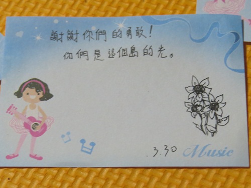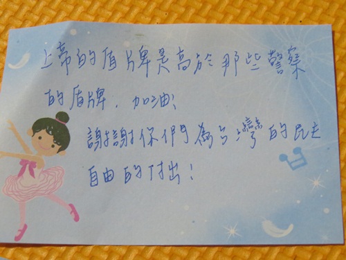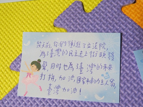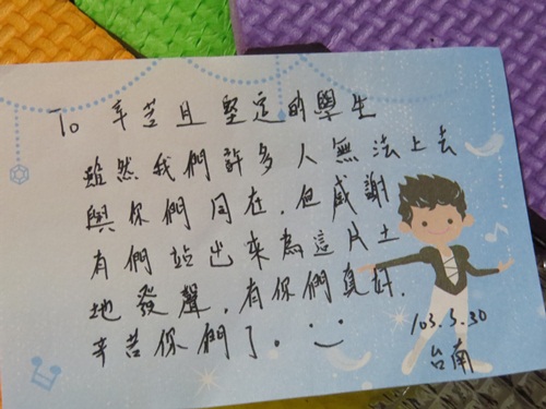 雖然不能親自到學運現場,台南南門教會的青年還是想辦法寫卡片,透過總會教社幹事林偉聯牧師轉交,為學運的青年們打氣!