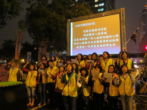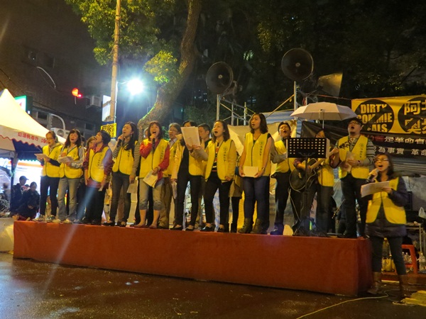 一群平信徒自發集結而成的聯合詩班,身穿黃色背心,不畏日曬雨淋、日夜在立法院旁以詩歌守護台灣,被NGO團體譽為「太陽花詩班」。自323佔領行政院事件爆發後,2位基督徒媽媽,終於按捺不住在電腦前爬文按讚,努力想為太陽花學生做些事,於是透過臉書召集夥伴,從不知道有多少信徒會加入,到近40位來自各教會的基督徒自發性的集結,在濟南教會後方不鏽鋼鐵門教室內練唱,每天在青島東路、中山南路、濟南路廣場,上台獻唱詩歌,受到支持學運的群眾熱烈歡迎。 「天色漸漸光,咱就大聲來唱著歌;一直到希望的光線,照著島嶼每一个人。天色漸漸光,咱就大聲來唱著歌;日頭一(足百)上山,就會使轉去啦!現在是彼一工,勇敢的台灣人。」小小的教室,擠滿互不認識的朋友,以不輪轉的台語練唱太陽花學運歌曲<島嶼天光>、<你敢有聽到咱的歌>、<伊是咱的寶貝>、<願>及多首教會詩歌。 發起人之一,濟南教會會友、身懷雙胞胎的陳主揚說,318學運一開始,她就很關注媒體的消息,但她不相信學生佔領立法院會像媒體說得那麼恐佈,第二天她就趕到教會,到立法院現場看看有沒有什麼需要幫忙。後來她看到總會幹事林偉聯牧師的臉書發訊息說需要音樂表演人才,就和幾位精兵協會的老同工商量籌組詩班。 門諾會會友、已有3個小孩的核心同工蔡語恩在臉書留言說,「有時擔心沒台,有時擔心沒人,有時擔心沒琴,有時擔心沒投影或沒電腦,或沒人串場……,七天後的我終於明白,有了上帝,一切都不缺乏。」他們曾經一天唱滿五場,回家時已完全沙啞失聲。甚至當「白狼咆哮,警力團團包圍青島東路,舞台封鎖,獻詩取消,同工仍練詩祈禱守望」。「每一天,都不在計畫中上演,但主上帝祂親自為我們擔綱,我們只管配合演出。而祂的計畫總是最好的,祂的時間從不錯誤,我們只管交託仰望。」 透過詩歌,太陽花詩班在學運中已展開撒種的工作。蔡語恩說,獻唱後,曾經有一個女孩子眼眶泛淚地說:「可以請問您在哪裡聚會嗎?我也是基督徒,我好久沒有親近上帝了,聽到你們的詩歌,我不能自已,我可不可以跟您們一起聚會?」許多民眾覺得好聽,還跟他們要歌詞,甚至還跟著禱告,一起說「阿們!」。 有同工在獻詩後分享說:「重點不僅僅是用詩歌安慰大家,重點是讓神透過我們跟大家站在一起;我不知道還有什麼場合能像這樣,台下有好幾百人安心聽著詩歌、跟著禱告。」「其實要邀請一個非基督徒參加佈道會有多麼難大家都知道,但今天有幾百上千人坐在那裡等著聽上帝的詩歌,這才是傳福音啊!傳福音本來就不應該是拉人進教會,而該是將教會搬入人群」。 學運青年佔領立法院第21天,4月7日晚上八點,學運領袖陳為廷召開記者會,宣佈週四晚上六點退出立法院議場。已連續唱13天的太陽花詩班,當晚有近40位參與,其中有兩位是學生,其他都是上班族、媽媽們、大學教授或長執同工,包括:濟南教會青年和長執、士林教會雅歌詩班、和平教會、雙連教會、七張教會、民權教會、板橋教會、士林靈糧堂、好消息電視台員工、北大真理堂、基隆召會會友、城市之光教會、…等來自不同教會的基督徒,大部分都是透過臉書自發性的參與,他們在自我介紹、發表感言時,顯得依依不捨,練唱時數度紅著眼眶。 太陽花的革命精神,串連著這群不同教會基督徒的生命情感,他們已說好要陪學生和大家到最後一刻,將繼續用歌聲、禱告守護太陽花。