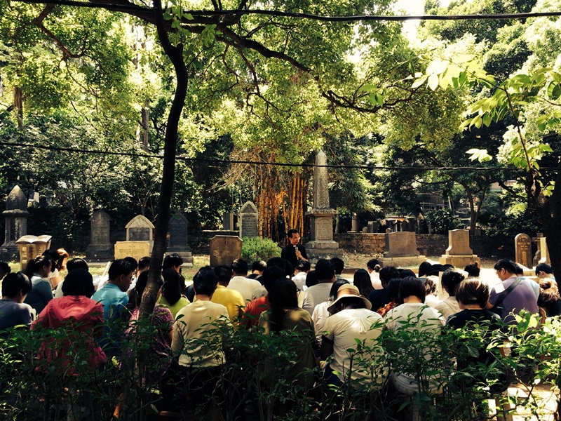 青少契輔導在馬偕墓園前參加主日禮拜(魏寧攝)
