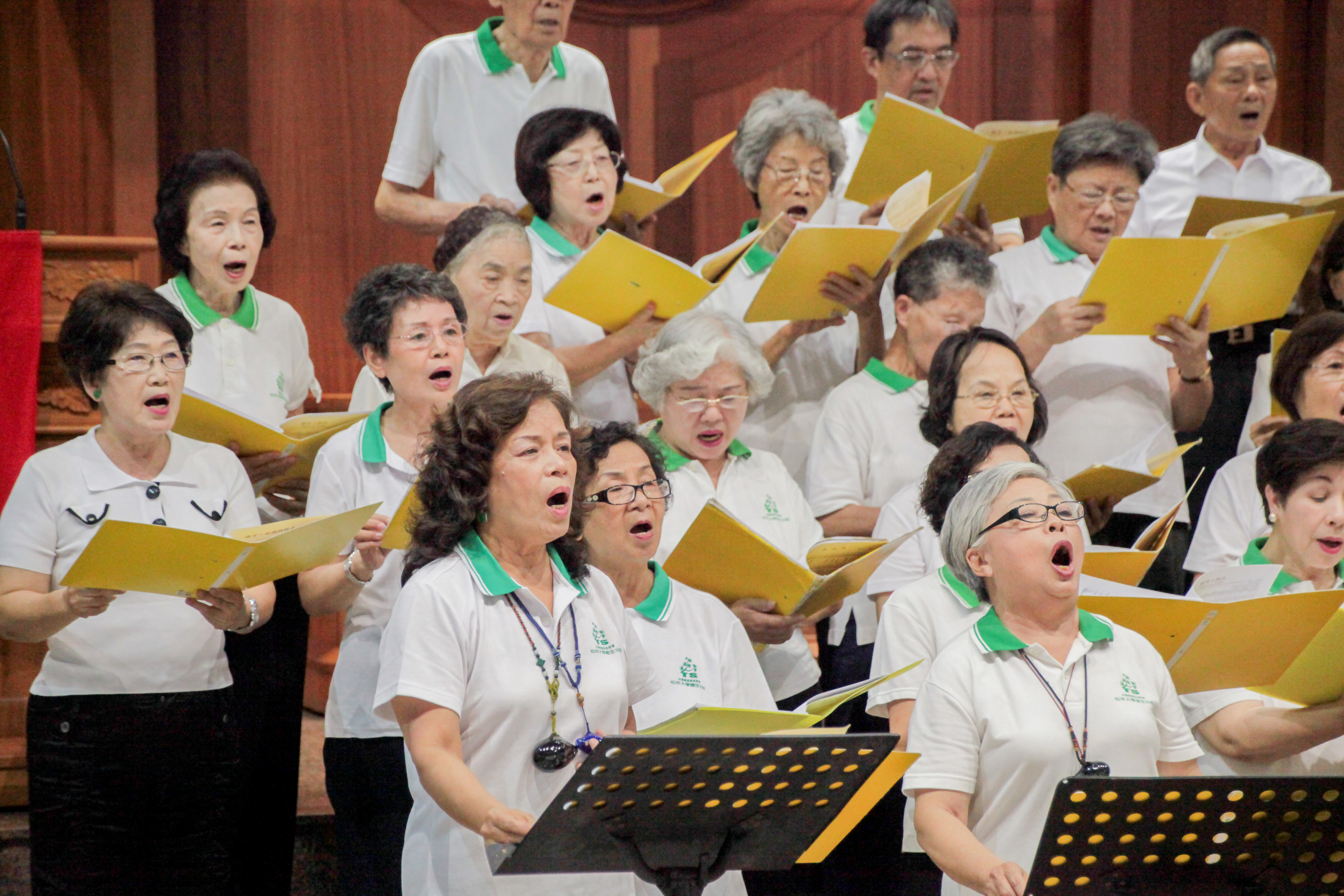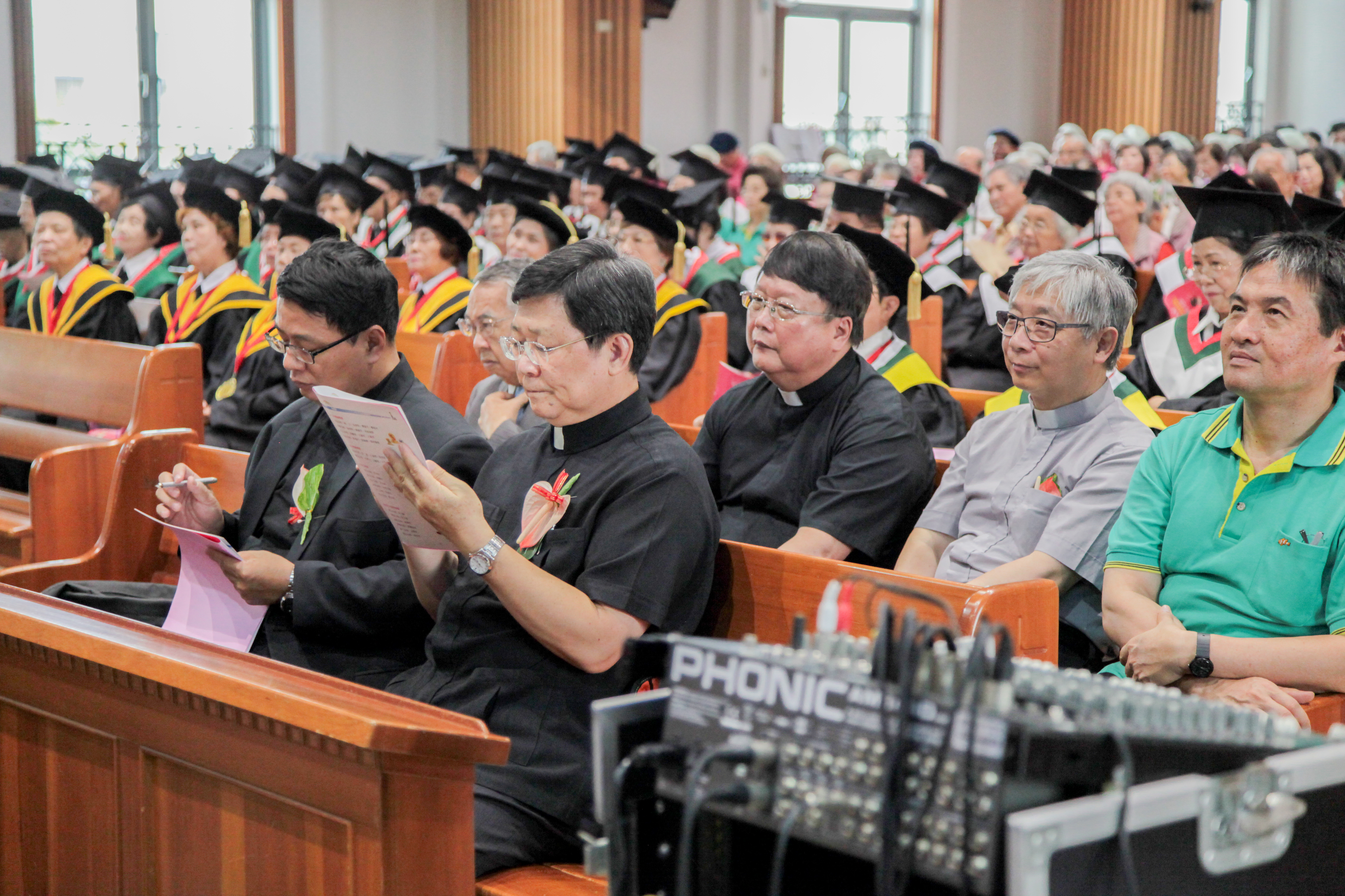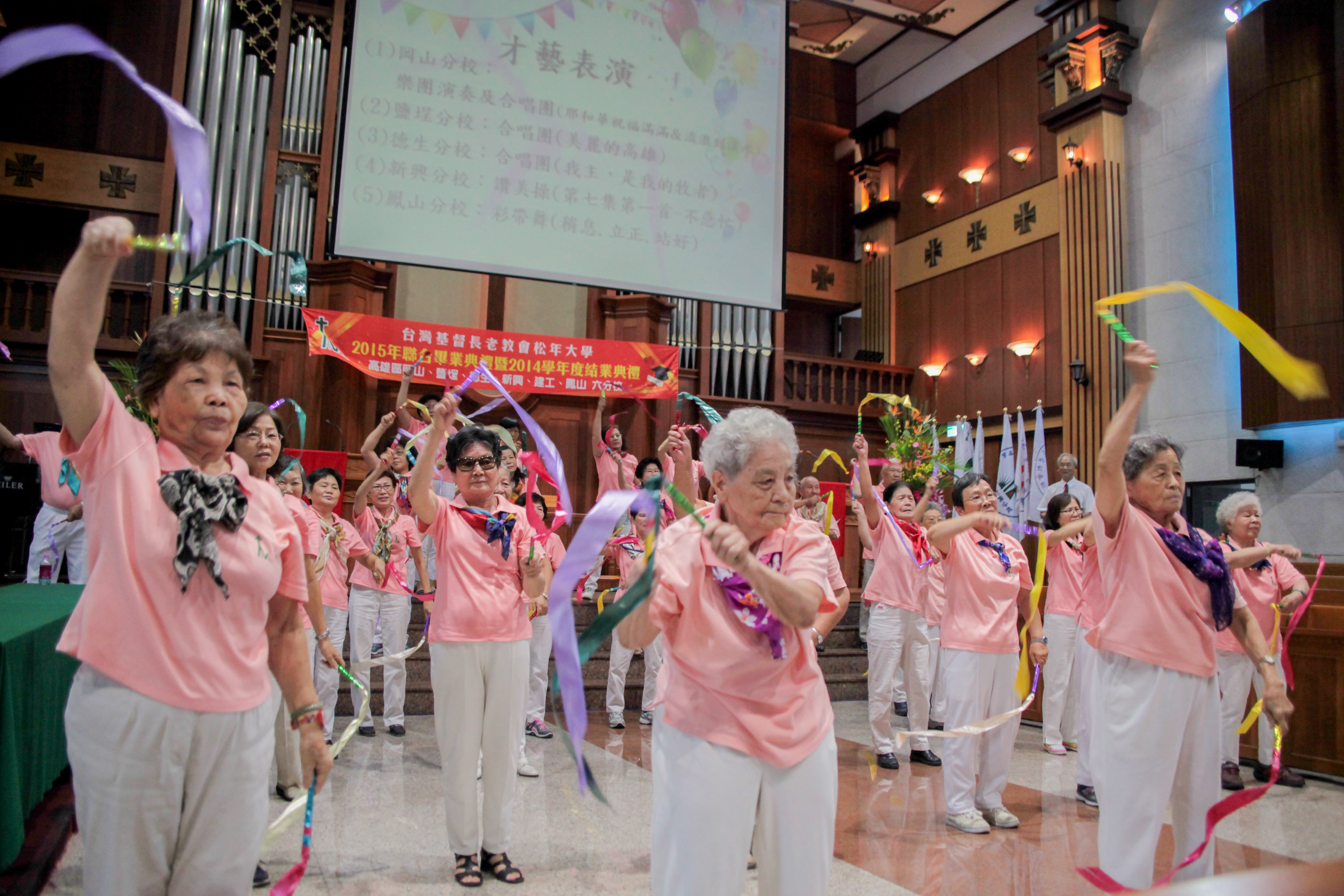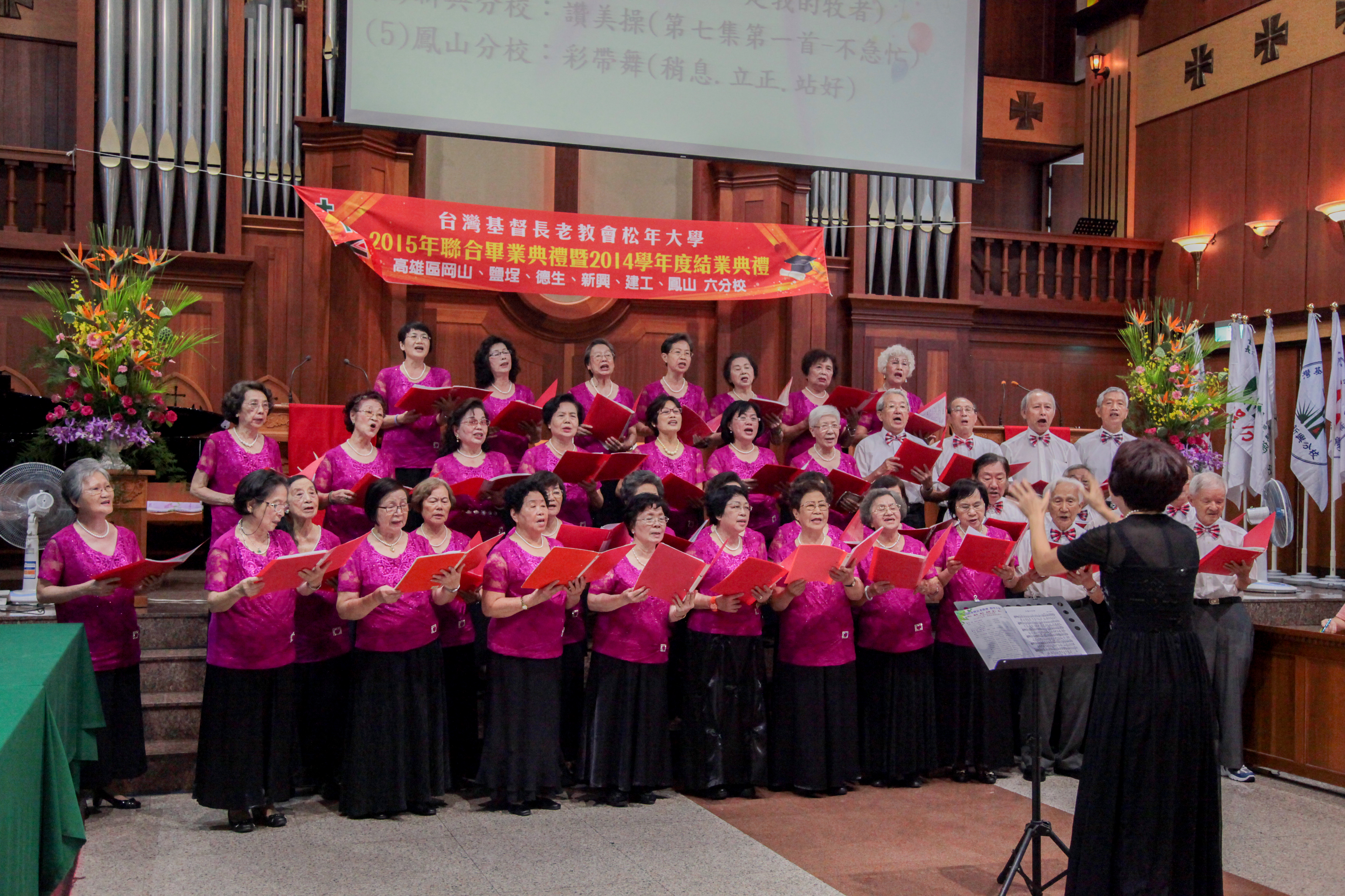 總會議長鄭文仁牧師勉勵松大畢業生:「活到老、學到老」 6所分校分別是岡山、鹽埕、德生、新興、建工及鳳山分校。雖然天氣炎熱,松大學生仍興奮地戴上方帽,穿著學士、碩士和博士服裝,精神奕奕地高唱松大校歌,鳳山分校聖歌隊唱聖詩〈豐收百倍〉,讚美上帝。長老教會總會議長、松年大學總校長鄭文仁牧師提醒,松年大學的傳統是「活到老、學到老」,博學班七級讀完要花21年,畢業後還是能繼續學習。鄭文仁牧師以約書亞記14章6-15節勉勵,要如同迦勒信靠耶和華,心存感恩,積極進取,到了85歲仍然可以散發出燦爛的光輝,過著充滿「金色年華」的信心生活。