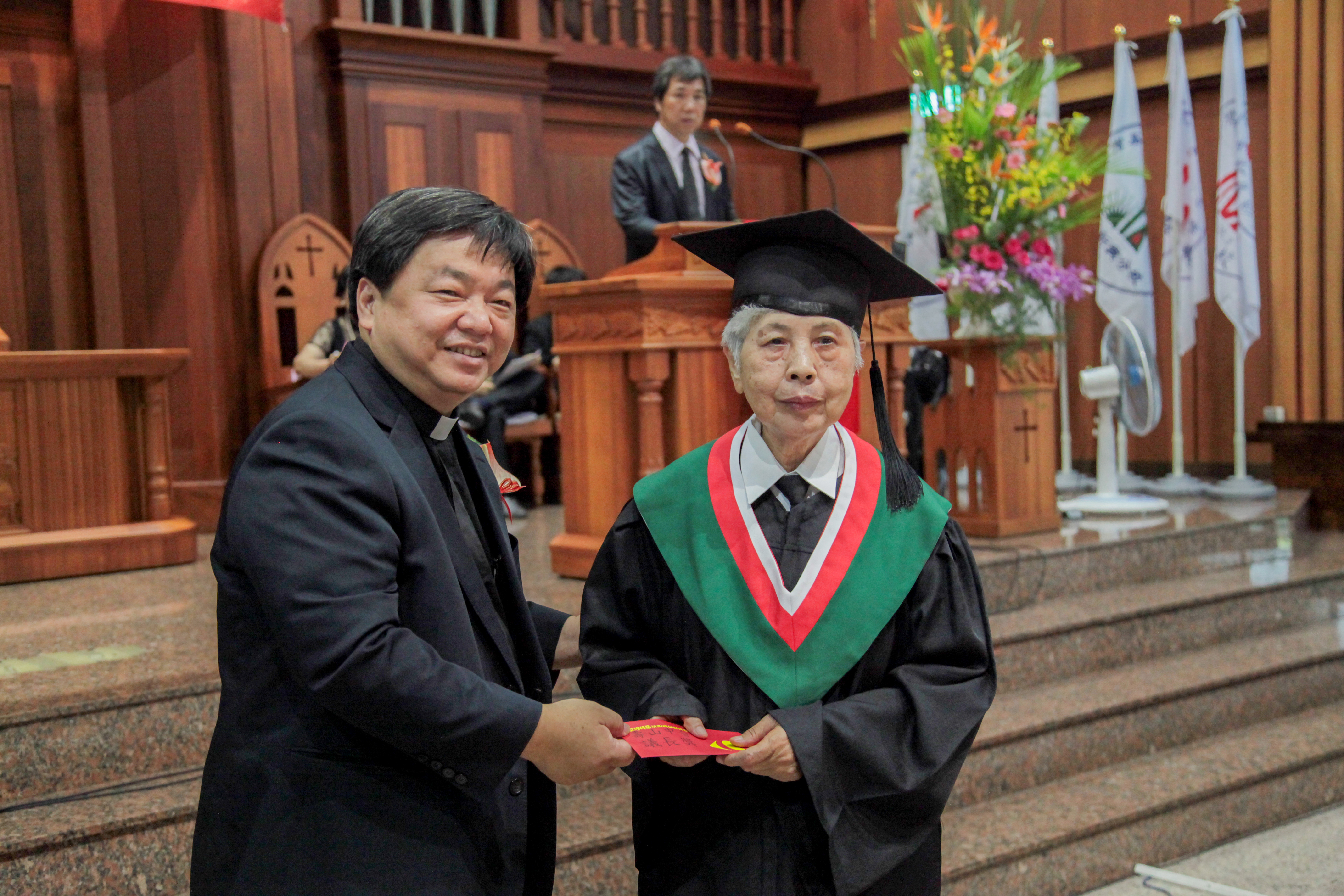 高雄中會副書記吳典林牧師頒發高雄中會議長獎 畢業生代表由新興分校碩士班吳蔡獻銀發表感言。她很感謝上帝,讓她在這個年紀有機會「讀冊」,實在很有福氣!松大的老師、牧師和醫師都是笑咪咪的、又很幽默。課程內容活潑、有趣,有醫療保健、電腦課、讚美操、陶笛…等等,讓她的身心靈獲得滿足,也滿足她年少時求學的願望。 畢業證書由總校校長鄭文仁牧師頒發,各校校長代表授予結業證書。另外,還有總校校長獎、總會松年事工委員會獎、壽山中會議長獎、高雄中會議長獎、高雄市長獎、高雄市民政局長獎、高雄市社會局長獎等,獎項非常豐富。