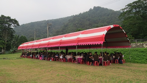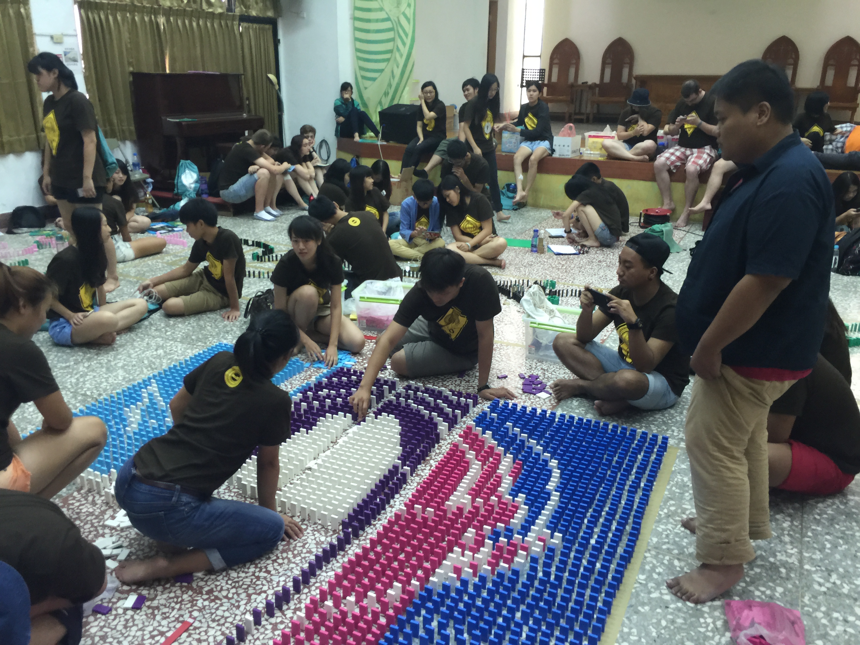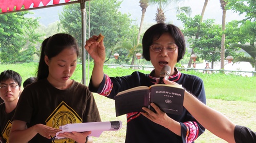大會同工精心設計骨牌活動(林佳靜攝) 經過前一晚的瘋狂,第二天早上各國青年還是準時9點集合,大會同工精心設計了骨牌活動,參考排灣中會佳義教會青年Langpaw Tupeleng 所設計的ILT海報,讓各組發揮創意排出圖案。 下午的閉會禮拜,鄭君平牧師特別邀請總會客家宣教委員會幹事賴德卿牧師主持客家聖餐禮拜。在謝緯營地外的大草坪上,特別佈置成台式辦桌的樣子,賴牧師準備了客家肉餅和紅色桑葚汁,象徵主耶穌的身體和寶血,讓普世青年一同分享客家聖餐,代表在主裡彼此接納、彼此連結。唯一美中不足的是,聖餐杯的數量準備的不夠,但幾位青年同工隨機應變,讓國外青年先行享用。在愛宴中,大家都有機會品嚐客家擂茶,分享客家人的愛與美味的食物。
