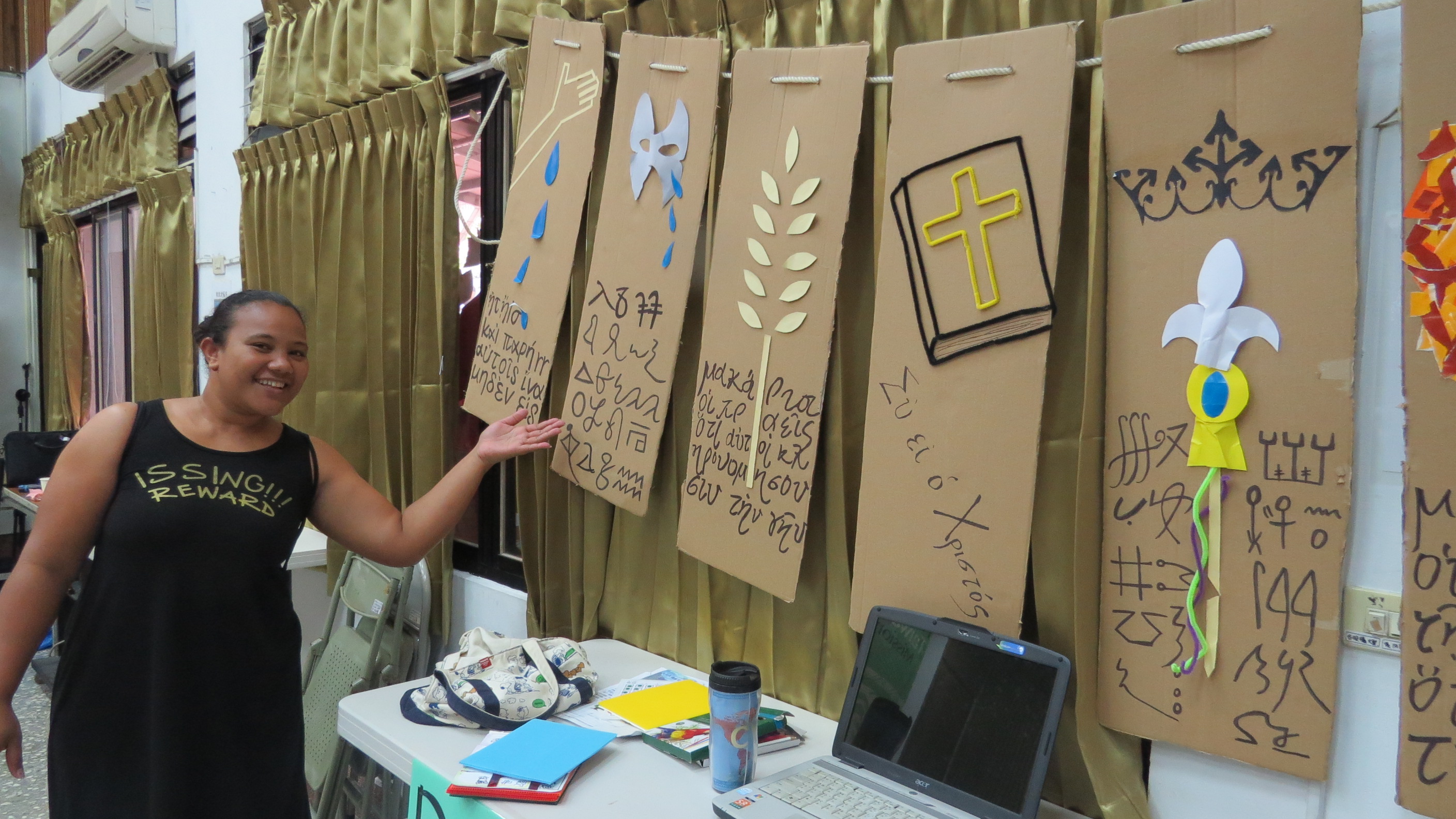 ILT青年到宜蘭頭城教會服事(總會青年提供) 愛台志工葉惠多與馬來西亞青年陳敏,一連7天參與宜蘭頭城教會兒童營和青少年營會的服事。因為當地教會的青年只有國、高中生年紀,帶活動的經驗都不夠,她們就要變成青年輔導,負責帶英文詩歌和團康活動。行後會,各組青年發揮創意在大禮堂佈置動態展覽,他們帶回來各地的紀念品和滿載珍貴回憶的照片,到處都可以發現「恩典的記號」。