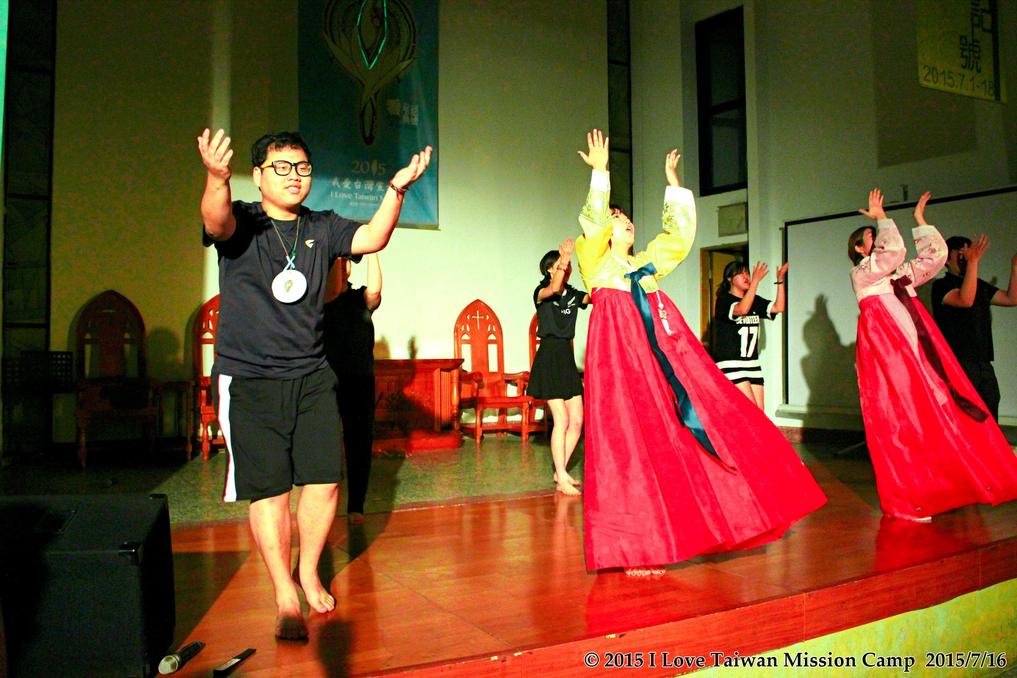 普世青年發揮創意佈置動態展覽(林佳靜攝) 「文化之夜」是每年行後會的高潮,7 月16日晚上,大會同工精心準備開場秀,一開始就在舞台上勁歌熱舞,HIGH翻全場。各國青年也拿出壓箱寶,加拿大青年高唱國歌;新加坡青年介紹新加坡式的英語;日本青年介紹日本文化、美食和動畫;韓國女生穿著傳統服裝,表演優雅飄逸的舞蹈,又突然搖身一變跳起活潑勁辣的舞步;馬來西亞青年陣容龐大,他們身穿著色彩豔麗的服裝,表演傳統民俗舞蹈,整個畫面非常好看。世界傳道會(CWM)-TIM的12位國際青年最瘋狂,他們表演吉里巴斯的戰舞,在舞台上嘶吼著喊出「ILT!」,向各國青年叫陣;最後由排灣族青年帶領普世青年圍成圈圈,歡慶ILT的豐年祭,將文化之夜帶到最高潮。