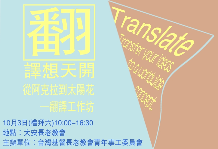 從阿克拉到太陽花──翻譯工作坊 Transfer your ideas to a worldwide concept. │時間:10月3日(禮拜六) 9:30-16:00 │地點:大安長老教會(臺北市和平東路3段1巷51號) │主辦:台灣基督長老教會總會青年事工委員會 ──當天備有午餐與茶點── 9月25日前劃撥報名費每人酌收200元, 現場繳費每人酌收300元(限額20名) --------------------------------------------------------------------- 從基督信仰角度窺探經濟正義 以言語橋樑為這個世界而行動 阿克拉信仰告白(The Accra Confession): 於2004年 來自 世界歸正教會聯盟所立的經濟與生態公義協約 特別邀請: 太陽花運動國際部總負責人之一 鄭凱榕小姐分享於學運中擔任翻譯、為臺灣發聲的歷程; 連振翔傳道分享長年於普世活動中,看見信仰如何與翻譯形成連結; 邀請你與妳一同以翻譯的視野為經濟公義而立約; Use your gifts to serve this world. 《今日,我們將採取一個信仰的委身行動》 --------------------------------------------------------------------- 繳費流程: (1)至郵局劃撥報名費 ☆郵政劃撥帳號:19566285 戶名:財團法人台灣基督長老教會宣教基金會 (2)將劃撥收據拍照,E-mail或Line給青委會辦公室,請務必註明您的姓名。 ☆E-mail:youth@mail.pct.org.tw ☆Line ID:@iqd5906q (3)收到青委會的回覆信件或訊息後,代表報名成功。 --------------------------------------------------------------------- 事工聯絡人: 台灣基督長老教會總會青年事工委員會 青年幹事:鄭君平牧師 事工助理:林宛柔姊妹 地 址:10647台北市大安區羅斯福路3段269巷3號 聯絡電話:02-2362-5282分機511 傳真電話:02-2363-1722 電子信箱:youth@mail.pct.org.tw Line ID:@iqd5906q |