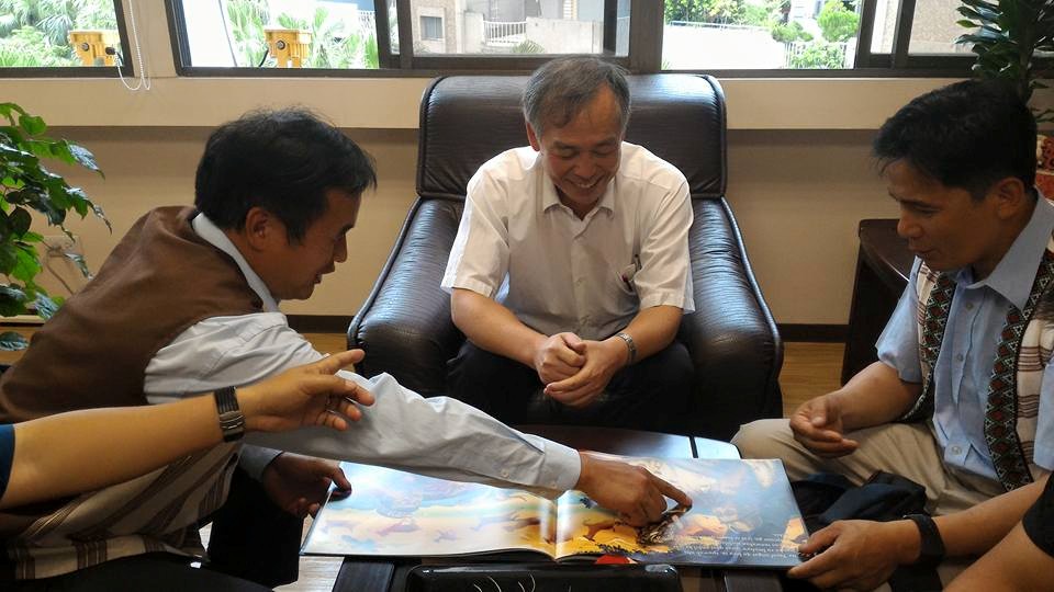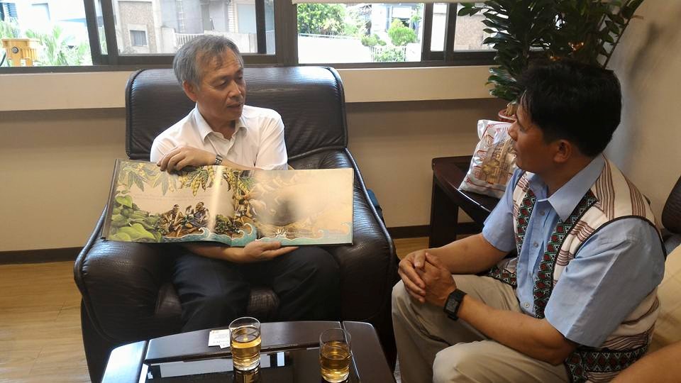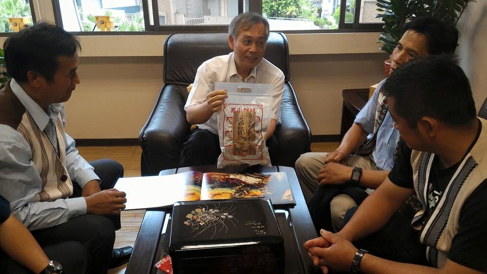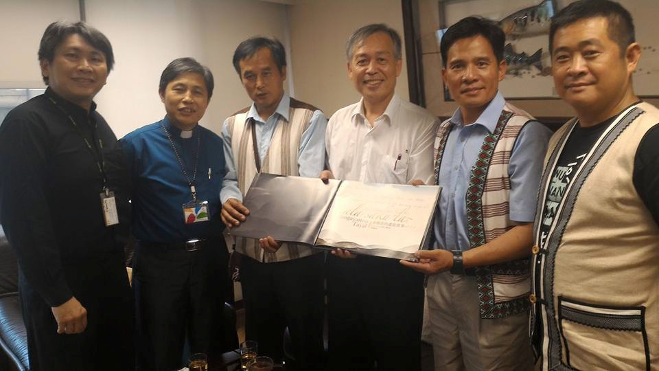 司馬庫斯教會亞拉‧比呼牧師與優繞、阿明長老,9月7日拜訪台灣基督長老教會總會總幹事林芳仲牧師,長老們特別預備司馬庫斯部落土產的段木香菇,及該部落自己出版的第一本書《祖先遷徙史》贈予總幹事。據長老表示,該書完全用泰雅爾母語寫成,是司馬庫斯部落的森林小學必讀的教材。(圖文/國際教會魯噶傳道師提供)