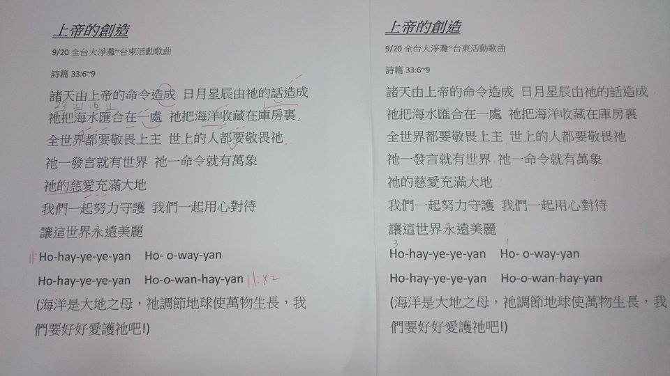 Pinuyumayan區會淨灘歌曲,詞/詩篇33篇;曲/少多宜(影片由少多宜長老提供)