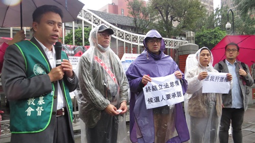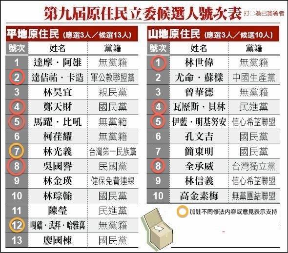 公民監督國會聯盟政策部主任洪國鈞指出,現任原民立委問政不及格 公民監督國會聯盟政策部主任洪國鈞指出,許多現任的原住民立委在過去的會期中表現根本不及格。例如,國民黨立委高金素梅在第八屆中有六個會期被評為待觀察立委。她辯稱,因為許多議題與原住民族無關而沒有去參與。對此,洪國鈞頗不以為然,他認為「長照法、年金改革和國土計畫議題,有哪些不跟原住民族有關?」他也點名孔文吉,「他很少提法案,也很少針對制度做修正,反而是公然的在立法院的質詢台上針對個案做人事的關說。」這並不是大家所希望見到的原住民立委。洪國鈞表示,提案並不困難,原住民團體已經擬好法案內容,只要有立委願意送出去就可以了! 截至目前為止,簽署的原住民候選人有:馬耀‧比吼、鄭天財、林世偉、瓦歷斯‧貝林、吳國譽、全承威、伊藍‧明基努安、達佶祐・卡造。另外,林光義及嘎礌‧武拜‧哈雅萬,加註不同修法內容或意見表示支持。簽署的政黨有:民主進步黨、自由台灣黨、台灣團結聯盟、時代力量、樹黨、軍公教聯盟黨。 無黨籍平地原住民候選人嘎礌‧武拜‧哈雅萬對於狩獵權則有不同觀點。「去菜市場買菜需要報備嗎?為何打獵需要事前審查及事後報備?」他主張原住民族依照其傳統祭儀及文化不需要事前審查及事後報備。他說,獵槍本來就是生存工具,根本不需要規定其規格及樣式。如果有社會安全考量,只要做好登記管理即可。 長老教會總會教會與社會委員會幹事林偉聯牧師表示,長老教會有三分之一的信徒是原住民。「使用獵槍,對於原民來說是人權、是生存權,怎麼可以搶奪他們謀生的重要工具?」原住民與整個山林和大自然在一起,他們知道這是上帝所賞賜的寶藏,懂得維護生態平衡,槍枝的濫用根本跟打獵無關。他呼籲,今年要參選立委都能夠正視原住民使用獵槍的問題。 台灣原住民政策協會成員蕭世暉(Pasang Hsiao)表示,已經有5萬多位原住民因為〈動保法〉而入獄,原民立委到底有沒有看見?過去立法委員的怠惰,讓原住民無法安心的在山上過生活。透過這次大選,雖然有總統候選人開始關心,但關心不是同情或慰問,而是要有具體行動到立法院修法。他肯定這些簽署的立委候選人,「把票投給他,不是由你玩四年,而是接受原民委託,積極修改法令。」
