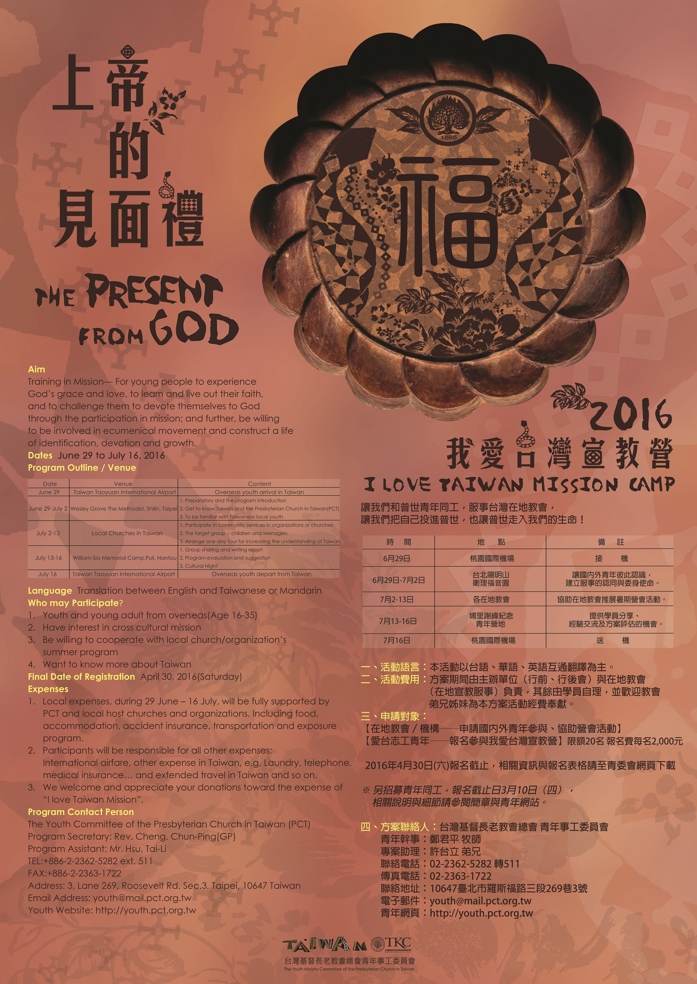 讓我們和普世青年同工,服事台灣在地教會, 讓我們把自己投進普世,也讓普世走入我們的生命! 主後2002年開始至今年, 「我愛台灣宣教營I Love Taiwan Mission (ILT)」即將邁入第十四屆。 每年台灣基督長老教會總會青年事工委員會會致函普世機構、夥伴教會與海外台灣人教會,邀請青年來台參與台灣在地夏季學校及社區關懷事工,並開放台灣青年報名參與愛台志工服事;同時,也邀請有意願合作的地方教會申請ILT方案。青年經媒合後,將受派至申請合作ILT的台灣地方教會參與服事。 ILT的目的與精神就是要讓青年朋友從服事參與中體驗生命的意義與價值,並藉著社區宣教、暑期兒童活動或青少年營會等等事工,使國內外青年更加認識、疼惜台灣;我們也相信,對在地教會而言,更將帶來嶄新不同的經驗與使命,以促進在地教會參與普世合一運動。 鼓勵台灣各地教會、機構、學校申請「2016我愛台灣宣教營」 鼓勵青年報名「2016我愛台灣宣教營」愛台志工 因著主耶穌基督的愛,盼望我們共同的參與,能帶出豐盛的生命。 ◎主題:上帝的見面禮 ◎時間:2016年6月30日-7月16日 6月29日-7月 2日/陽明山衛理福音園─行前訓練會(含接機) 7月 2日-7月13日/分派至各在地教會─參與在地宣教服事 7月13日-7月16日/埔里謝緯紀念青年營地─行後分享會(含送機) ◎報名截止日:2016年4月30日(六) ◎公函、邀請函、簡章、申請教會須知、教會申請表、愛台志工報名等,請詳附件。 ※ 另招募青年同工,報名截止日3月10日(四),相關說明與細節請參閱簡章與青年網站。 ◎方案聯絡人: 台灣基督長老教會總會青年事工委員會 青年幹事:鄭君平牧師 專案助理:許台立弟兄 電 話:02-23625282#511 傳 真:02-23631722 地 址:10647台北市羅斯福路三段269巷3號 電子郵件:youth@mail.pct.org.tw |