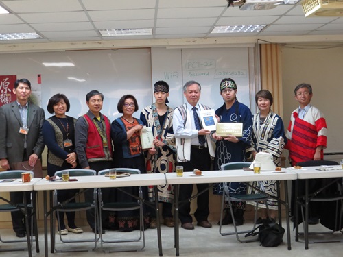 日本札幌大學愛努民族學生團契致贈禮物給長老教會總會(林佳靜攝) 日本札幌大學副校長本田優子博士帶領愛努民族學生團契、大學教師及家人等共26位,2月26日至3月3日進行訪台研習旅行。由總會助理總幹事E’leng牧師及總會原住民宣教委員會、普世關係委員會負責接待,並透過日本耶穌基督教團(Jesus Christ Church in Japan,JCCJ)函館中央教會二宮一朗牧師協助翻譯。 札幌大學本田優子博士為愛努民族設立獎學金制度,叫愛努民族青年可免費讀大學四年,並學習愛努民族傳統文化。該團契常赴日本國內外各地分享,本田博士希望他們也能跟台灣的原住民學習。 總會總幹事林芳仲牧師表示,15年前他曾到北海道,當時愛努民族代表聽到台灣原住民族的歌聲,因為感覺非常親切而掉眼淚。林總幹事說,台灣原住民族因為爭取原住民自治及正名運動,如今可以很自然的說出自己原本的名字。他也勉勵愛努族學生能在自由民主的制度下,活出自我的價值和尊嚴。E’leng牧師也介紹長老教會原住民族的宣教概況;總會原宣教社幹事歐蜜‧偉浪牧師提到,民進黨總統當選人蔡英文的原住民政策;原宣教育幹事蘇畢娜牧師介紹族語教材及近期將出版的《原音傳唱》專輯;普世幹事葉景安牧師則分享國際交流事工等。現場學生們發言踴躍,頻頻詢問關於基督教信仰如何與原住民族傳統信仰融合問題、長老教會族語教材推展成效、都市原住民問題…等。最後,愛努民族學生還表演了一場傳統舞蹈,向長老教會總會致謝。 日本札幌大學愛努民族學生團契此行還參訪了布農文教基金會布農部落休閒農場、台灣史前文化博物館、北葉部落、原民會、九族文化村、順益原住民博物館、原視、公視…等。