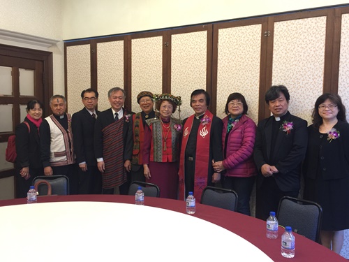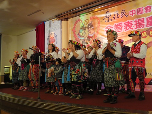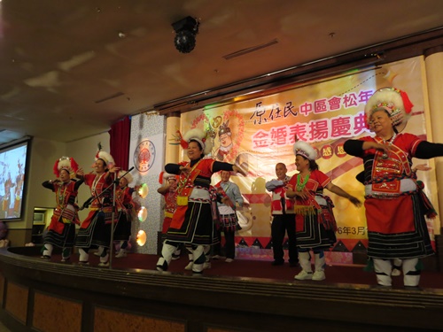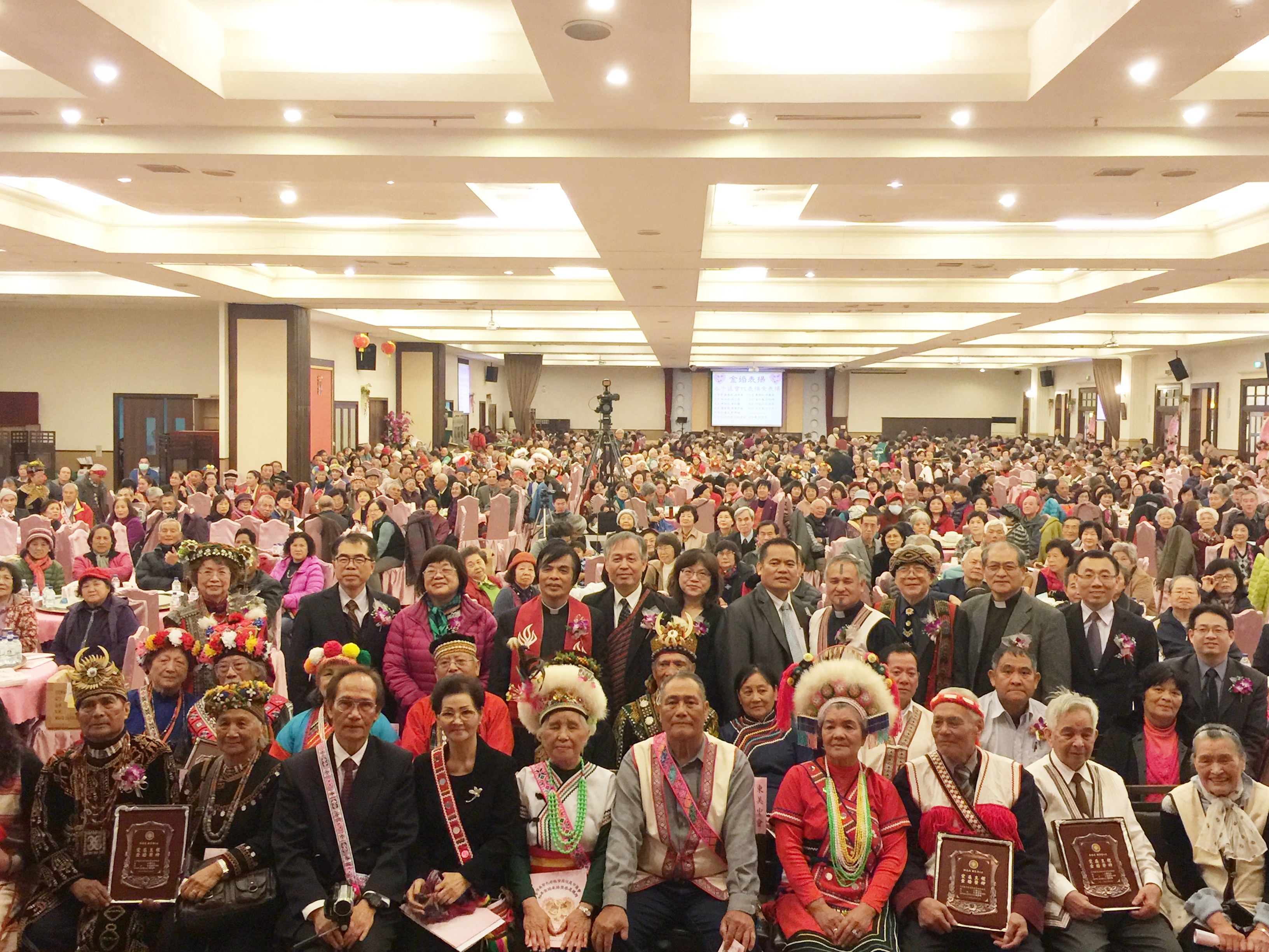 「原住民中區會松年金婚表揚慶典暨感恩禮拜」超過1500人參加(林佳靜攝) 延續去年慶祝長老教會宣教150週年「鑽石婚」的喜悅,今年總會松年事工委員會特別舉辦「原住民中區會松年金婚表揚慶典暨感恩禮拜」。3月14日上午,有155對金婚夫婦接受表揚,超過1500位來自各中區會的長老教會兄姊前來觀禮,宛如一個大家庭,一同領受上主的賜福。總會議長鄭文仁牧師、副議長舒度‧大達牧師、總幹事林芳仲牧師、彰化基督教醫院董事長陳信良牧師、彰化基督教醫院院長郭守仁長老、彰化中會議長王雅真牧師、阿美中會巴扶以善教會阿星‧阿曼牧師等人都到場祝賀。 早晨天還沒亮,一輛輛遊覽車從部落滿載著阿公阿媽,趕往彰化員林大家來餐廳。早上八點不到,彰化中會婦女部、松年部部員,早在入口處等候迎接貴客。許多70、80幾歲的阿公阿媽,穿著原住民傳統服飾,頭戴花冠,步履緩慢,小心翼翼地手牽著手,盛裝赴宴。