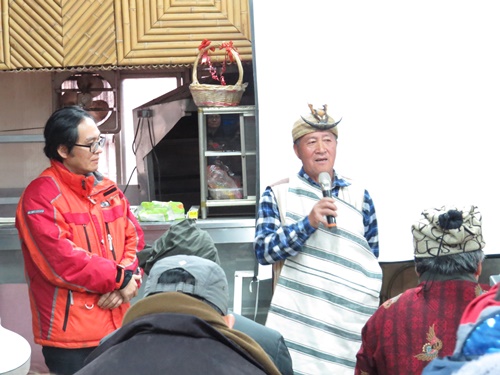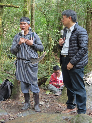 司馬庫斯教會Yuraw Icyang優繞‧依將長老(左)述說tnunan的故事, 林益仁所長協助翻譯(右)(林佳靜攝)