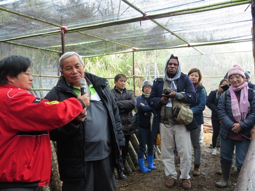 田埔部落耆老多蜜巴燕(左二)說明如何在颱風天打香菇(林佳靜攝)