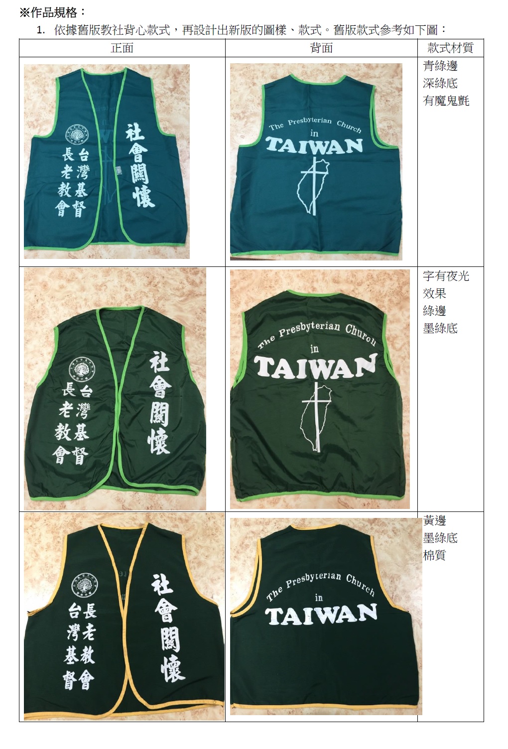 一、舉辦說明:本會舊款背心存量不足,需訂做新款背心。今年為教社年,故舉辦徵選比賽,邀請教會擴大參與。本次設計期待能有多功能性、創新、呈現出教社理念。並徵選出來的作品將作為台灣基督長老教會總會教會與社會委員會急難救助、社群關懷事工用背心。 二、活動日期: (一)截稿日期: 7月20日(三)下午5:00前截止。 (二)第一徵選日期:收到投稿作品起~至7月22日(五)(已結束投票) (三)第二徵選日期:7月25日(一) (四)得獎公佈:8月4日(四)上午10點。 三、獎勵方式: (一)得獎之名單將會在PCT教會與社會委員會粉絲頁及台灣基督長老教會總會網頁上公佈, 網址:https://www.facebook.com/pctsociety。 (二)優勝第一名全聯禮券5,000元、第二名3,000元、第三名1,000元。 四、相關活動辦法及比賽規則如簡章、公文,敬請參閱,可直接點選下載使用。敬請張貼於佈告欄或週報,鼓勵信徒踴躍投稿。 |