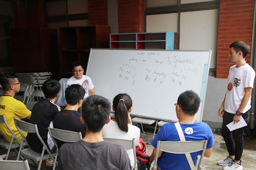 總會青年幹事鄭君平牧師教「大家說台語!」(林佳靜攝) 為了打開「阿爸的珠寶盒」,看看裡面有什麼新奇的寶貝?下午的議題工作坊,青年們參與十分踴躍。總會青年幹事鄭君平牧師親自開課教「大家說台語!」,他首先介紹台灣語言的源起,再教大家簡單的生活用語,如:感恩kám-un、平安pîng-an、謝謝to-siā、讚美o-ló、耶穌Iâ-soo…等等,還為現場學員翻譯自己的名字,翻譯組同工也努力的將台語翻成英語。看到國內外青年認真的學台語,令人相當感動。