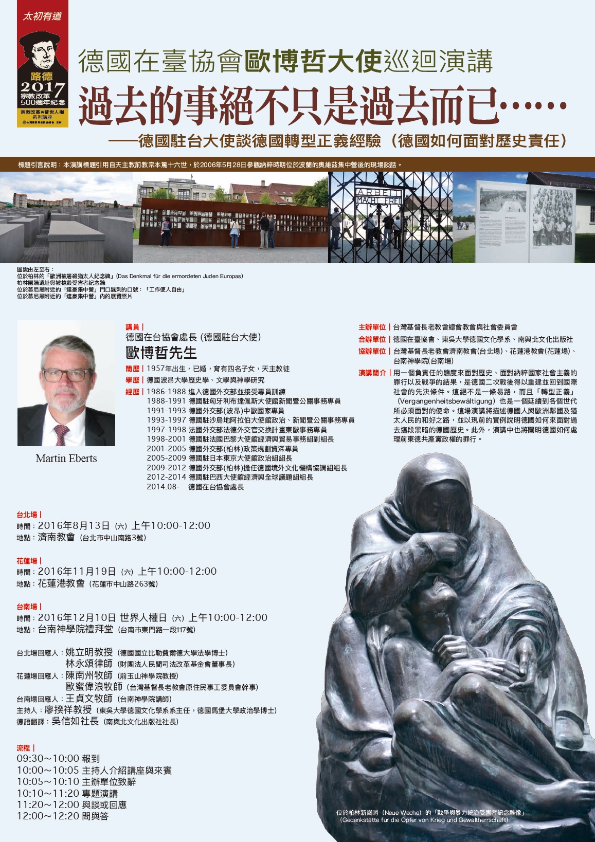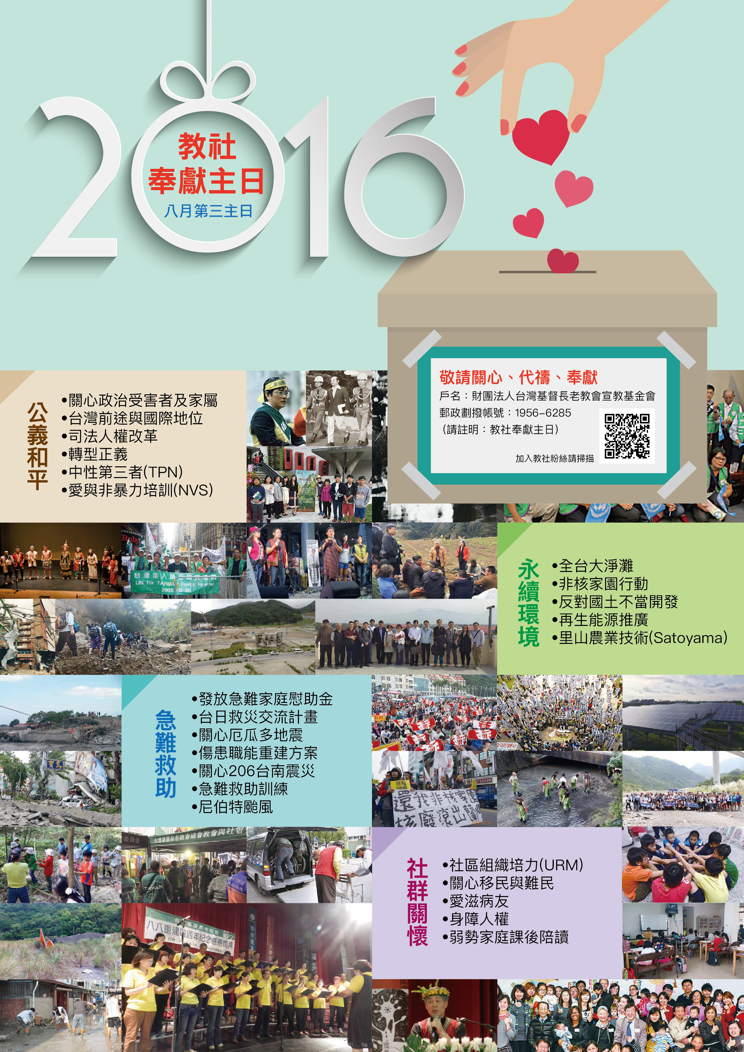 主 旨:敬請各教會牧長、信徒關心8月21日(8月第三主日)今年度「教社奉獻主日」並為我教會教社事工代禱及奉獻由。 附件下載:奉獻主日公文電子檔、參考講章2篇(從耶利米的受召觀看教社事工;隨時作好預備油)、奉獻主日海報1張、轉型正義海報1張。 說 明: 一、敬請各教會牧長或中會安排交換講台的報告者代表本會請安報告,並鼓勵信徒兄姐為本會事工經費關心奉獻。 二、本會受全體教會之託,致力於下列主要事工及計畫(從2015年8月起至2016年7月止): (一).公義和平: 1. 關心政治受害者及家屬,辦理「228事件69週年全台分區紀念追思禮拜」、「林冠華同學逝世一週年追思紀念會」。 2. 關心國家發展,聲援「反黑箱課綱行動」、推廣紀錄片「暴民」全台撥映計畫、辦理「原住民族轉型正義論壇」。 3. 推動世界人權日、人權事工(含司法改革)。 4. 辦理及推廣社會行動培訓事工如:中性第三者(TPN)、愛與非暴力(NSV)。 (二)永續環境: 1. 於6月舉辦環境主日,辦理「2016全台大淨灘活動」。 2. 重申1992年反核宣言,持續與反核團體合作,達成非核家園目標。 3. 持續關心東日本福島核災受難者心靈重建,辦理「2016福島小羊宿營in台灣」。 4. 推廣再生能源,加入台灣再生能源推動聯盟。 5. 反對國土不當開發。 6. 推廣里山農業技術(Satoyama),辦理「國際原住民生態農夫結盟會議」。 (三)急難救助: 1. 受理各中區會教社部及普世教會轉介急難救助個案申請。 2. 出版「公義行在前頭」台灣基督長老教會八八水災重建紀念專刊第一冊。 3. 關心海外「厄瓜多地震」、「緬甸水災」、「日本熊本地震」受災及重建狀況。 4. 關心國內「81氣爆」、「八仙塵爆」、「蘇迪勒颱風」、「206台南震災」、「尼伯特颱風」受災狀況,提供關懷陪伴、職能重建關懷方案等。 (三)社群宣教: 1. 於12月舉辦關懷愛滋主日,身心障礙者關懷日、關心移民與難民。 2. 舉辦組織領導訓練課程(URM),強化社區組織人才培訓。 3. 協助總會所屬之社會服務機構發揮其功能。 4. 協助地方與公部門之資源結合,辦理各類社會弱勢關懷事工。 四、請大家繼續為教社事工關心、支持、奉獻。願上帝祝福我們所做的事工! 五、2016下半年,本會舉辦了「德國轉型正義經驗分享會」,邀請 眾教會牧長、信徒、社區居民共同前往參與。 活動日期:8/13(六)濟南長老教會,上午10點起。11/19(六)花蓮港教會,上午10點起。12/10(六)台南神學院大禮堂,上午10點起。 相關活動詳情請詳閱轉型正義海報,本活動需提前報名,請洽:各中區會教社部或02-23625282*255 劉助理。 六、歡迎加入長老教會教會與社會委員會Facebook專頁粉絲,按讚追蹤最新事工消息。 網址:https://www.facebook.com/pctsociety。 | 奉獻款請寄郵政劃撥:1956-6285 《通訊欄備註:為教社主日》 戶名: 財團法人台灣基督長老教會宣教基金會 | 敬頌主恩永偕 主 委 鄭國忠 |