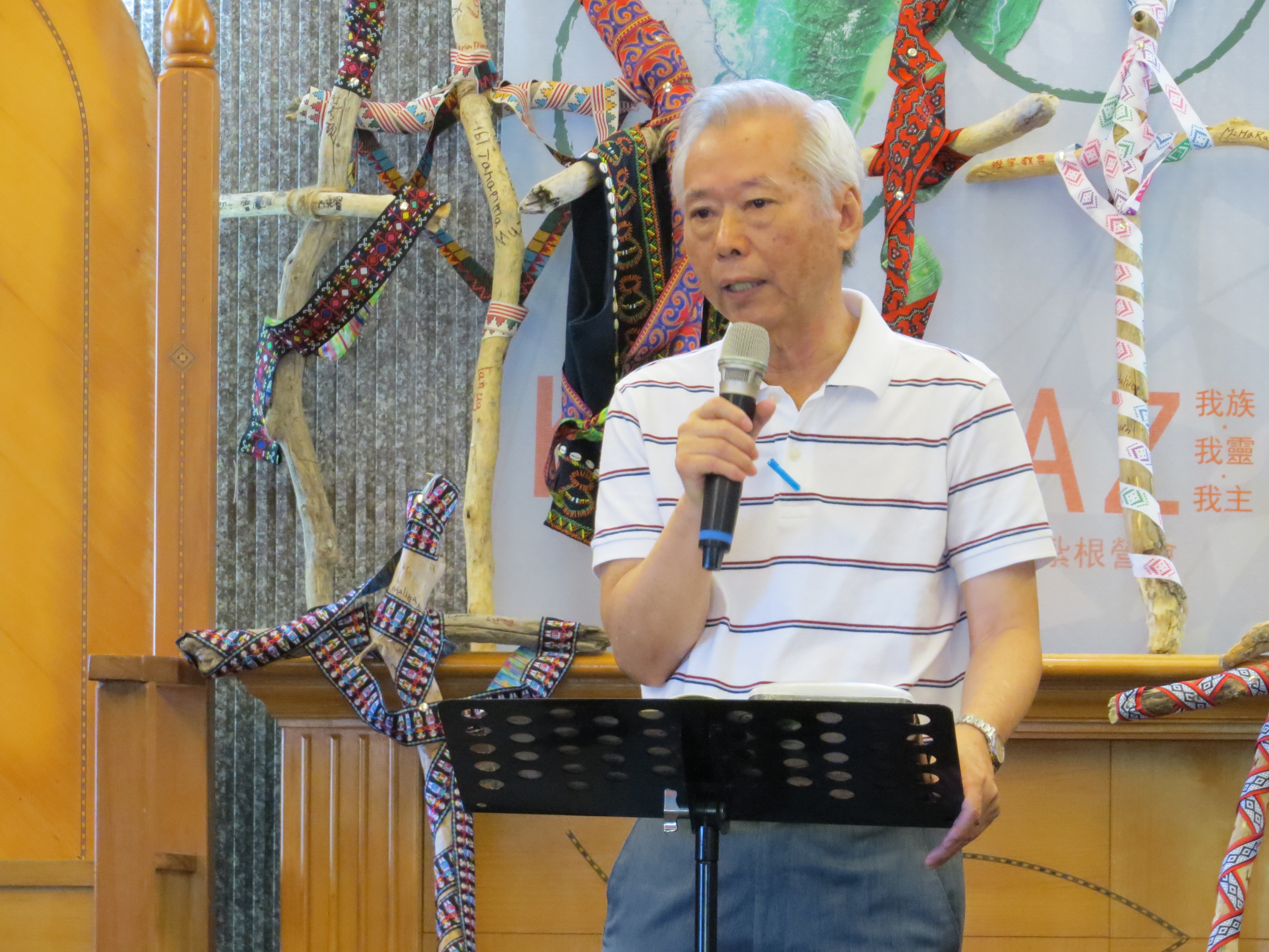 大專青年發揮創意以原住民傳統編織緞帶裝飾在十字架上(林佳靜攝) 然而,早期原住民經常藉由巫師呼喚祖靈,協助播種、打獵、求雨、喪禮等傳統祭儀,在教會內部引起爭論。早期原住民編織的紋飾,被認為隱含有「祖靈之眼」的涵意而有疑慮。但如今,已少有人認為穿戴原住民傳統服飾是違背基督信仰的行為,很多教會也把原住民的編織或圖騰應用在教會建築、十字架、禮拜堂內的各項擺設及牧師服上面。 陳南州牧師認為,原住民基督徒應積極參與文化復振的行列。原住民基督教會也應該在聖經、教義等方面有更多的教導,致力於制定公眾禮拜的禱文,以及原住民文化活動中的祈福禱文,使信徒能夠理解又感受到向最大的祖靈—上帝的禱告,也跟原住民的祖靈有所連結。 每天比還太陽早起的少多宜長老,喜歡在晨曦中,拿著自己手作的琴笛,唱新歌頌讚上帝。透過日常生活的實際經驗,他說,聖靈就像風在動,聖靈也如同生命氣息,存在於萬物之中。在大自然中,仔細聆聽,就可以感受到聖靈的同在。他鼓勵原住民青年,如同先輩一樣,順著聖靈的感動,唱出自己的詩歌。 AMIS旮亙樂團團長少多宜.篩代長老拿著自己手作的琴笛,唱新歌頌讚上帝(林佳靜攝) AMIS旮亙樂團團長少多宜.篩代長老拿著自己手作的琴笛,唱新歌頌讚上帝(林佳靜攝) 左金男牧師表示,長久以來,基督教會把不同於西方的文化,包括原住民的文化傳統,和耶穌基督的福音對立起來。以為地上的文化是人類墮落後的產物,導致人一旦成為基督徒就與本地文化告別,離開文化的根,變得什麼都不是。他提到,因為對信仰的誤解,曾發生歐洲十字軍東征,帶來更深的裂痕和仇恨。他認為,福音與文化有許多需要努力對話,絕對不是對立或不相容的,反而可以從不同的文化中看見上帝創造的多元性。