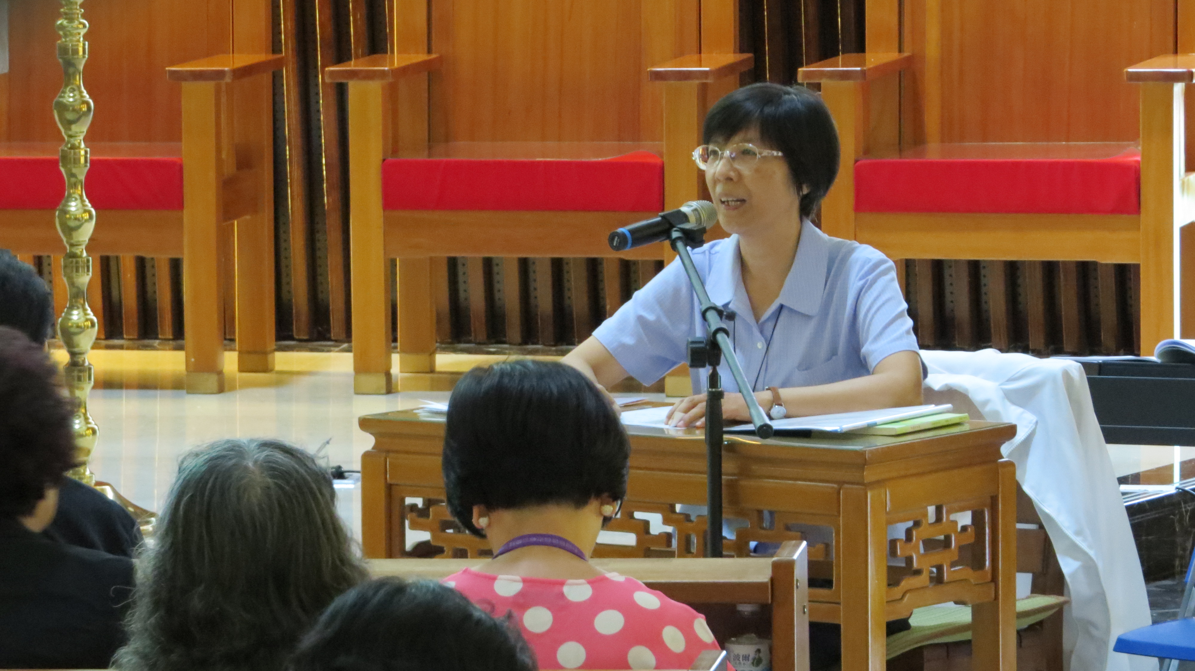 田亞蓮修女教導默觀祈禱 此次台語場,因李純娟修女接獲家人病危通知,而由田亞蓮修女臨時代理授課。田修女表示,靜觀是一種將專注力集中在此時此刻的操練。她鼓勵婦女安排獨自安靜的時間,進入密室,關上門,允許自己放鬆,去感受呼吸、皮膚與身體的關係,培養直接與上帝連結的直覺經驗,進行默觀祈禱。 為了體驗靜默,總會婦女事工委員會幹事連嫦美牧師鼓勵大家將手機奉獻出來,婦女們原本為著家事、工作和教會服事擔心,個個面露難色,交出手機後,才體會到什麼是完全的放下。經過三天兩夜的營會,她們學到有兩個教不要信:計較和比較。有婦女表示,自己是急性子的人,做事常常很匆忙,很少安靜走那麼長的路,沒想到靜默讓她感到無比的放鬆,她學到以後要在忙碌的日常生活中,為自己安排獨自安靜的時間,與上主連結。