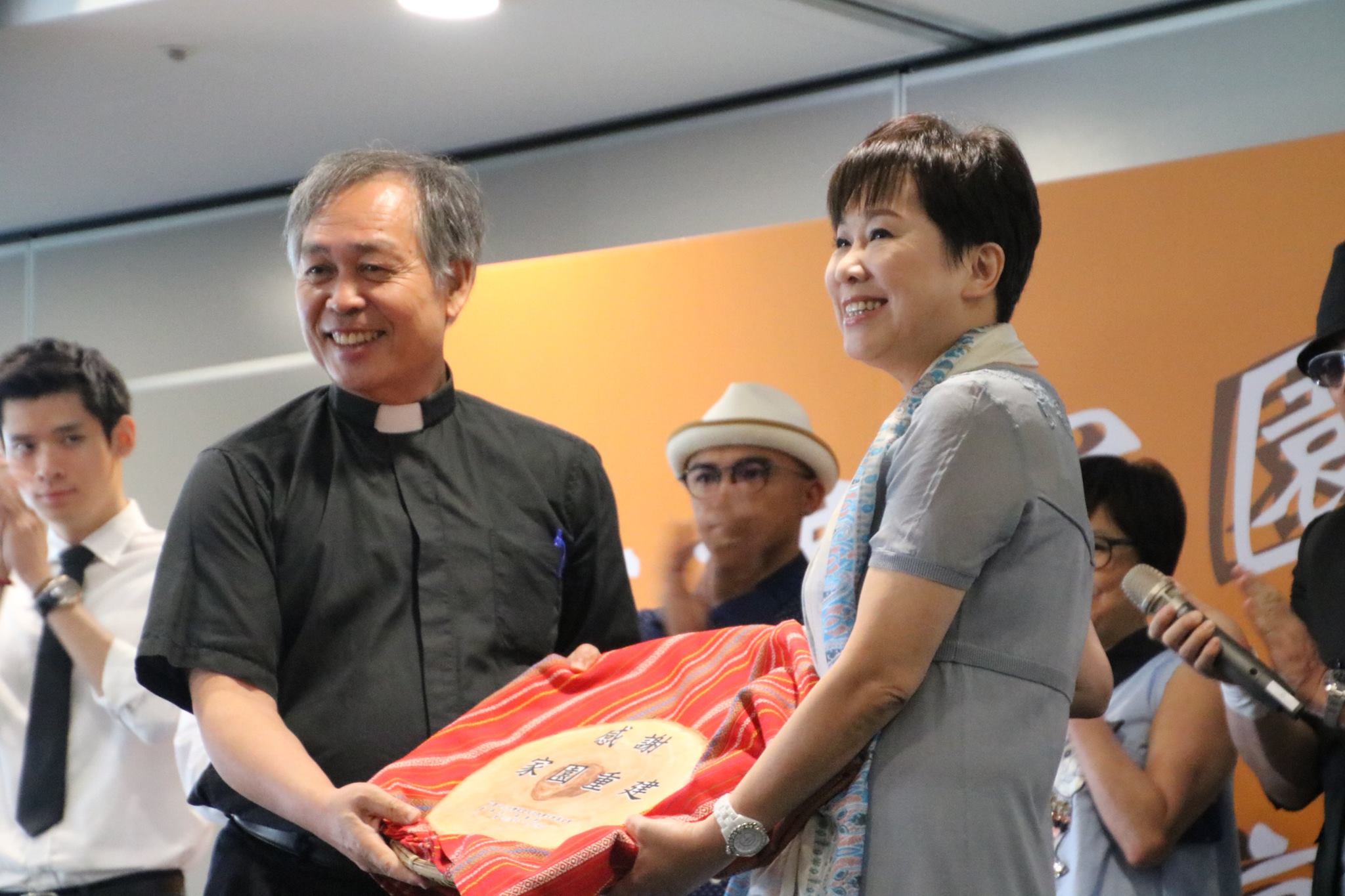林芳仲牧師致贈獎牌給紅果子群英會余湘董事長(林佳靜攝) 記者會中,長老教會總會總幹事林芳仲牧師特別致贈獎牌,給代表捐贈單位的紅果子群英會余湘董事長。林牧師表示,這副獎牌是為已故陳福春(Acun)牧師的母親陳貴妹長老,處理傾倒的龍眼樹所雕刻的,別具紀念意義。陳福春牧師曾是推動八八風災重建的關鍵人物,從前他幫助別人,如今由教會來照顧他的家人。