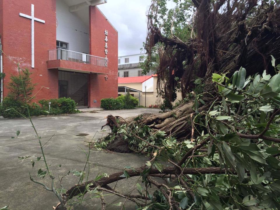 車城長老教會招牌掉落(林偉聯牧師提供) 下午,林偉聯牧師也前往恆春教會勘查,發現恆春教會百年榕樹倒塌在地。恆春教會一名信徒,家屋嚴重損毀,不堪居住。除了恆春基督教醫院復健中心鐵皮掀開、窗戶碎裂、多處淹水較嚴重外,因當地較少搭建工寮、鐵皮屋,目前恆春地區家屋情況都還好,主要是商用設施招牌或民宿業者木造加蓋設施毀損。 除此之外,大鵬灣教會一、二樓進水、電話線毀損;琉球教會牧師館進水;水底寮教會牧師館辦公室玻璃破碎。請為屏東中會所屬教會災後復原工作代禱。 莫蘭蒂颱風災害即時訊息請鎖定: 台灣基督長老教會總會教社委員會facebook粉絲頁並通報 https://www.facebook.com/pctsociety/ 華南銀行公館分行118-20-079667-1 財團法人台灣基督長老教會宣教基金會 敬請關心代禱!奉獻! 郵政劃撥帳號:1956-6285 戶名:財團法人台灣基督長老教會宣教基金會。註明:莫蘭蒂風災