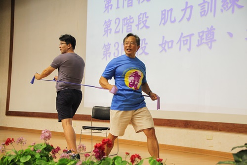 蔡三雄牧師(右)示範如何以彈力帶做肌力訓練(陳義明牧師攝) 從小體弱多病,因為努力自我鍛鍊而成為球隊選手、舉重及健美選手,後來成為拔河運動國家代表隊總教練的蔡三雄牧師,樂於和人分享運動的樂趣與意義。 蔡三雄牧師說,長者的老化是人體結構和功能隨時間而變化,是不可逆的過程。但積極且有規律運動,不僅增進健康和體能,甚至可減少不必要的傷害和跌倒。他當場示範如何以0.5公斤加重帶、彈力帶為主要輔助器材,進行肌力訓練。包括:第1階段體操伸展、第2階段肌力訓練、第3階段如何蹲和站。 蔡牧師表示,藉著重量或阻力的運動,能夠促進肌纖維的強化,增進肌肉的彈性,提高新陳代謝率,降低體脂肪和三高,保護骨骼的支撐力,改善生活品質,讓長者更有信心從事各種活動,進而延緩腦部的退化,成為健康有活力、有尊嚴的長者。 s.JPG)