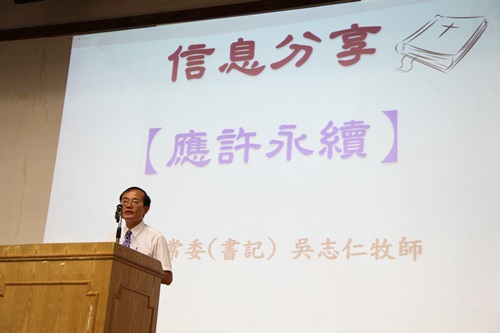 屏東中會里港教會吳志仁牧師以「應許永續」為題講道(陳義明牧師攝) 在閉會禮拜中,屏東中會里港教會吳志仁牧師以「應許永續」為題,闡述約書亞記23章5-9節,述說上帝所應許賜福的話沒有一句落空,都應驗了,但因後代子孫未能繼續敬拜上帝,招致滅亡,勸勉人要繼續遵行律法,敬拜獨一神。這二天他有機會和信仰的長輩分享到他們信主的經歷。發現每一個人信仰的歷程都不一樣,正如他是第五代基督徒,而他的師母是大學時代才信主,但都蒙上主賜福。他相信在座的信仰前輩,也盼望上帝的賜福從自身開始永續到子孫,就是祂賜福的應許。 總會松年幹事陳義明牧師表示,因強颱莫蘭蒂來襲,許多南部及花東地區的原住民牧長心繫家園安危,總會松委會考慮到牧長回程時的安全,決定提前結束大會活動。原本期待每年一次難得的聚會,雖然被颱風打亂有點掃興,但牧長們聽到可以提前回家,反而感到安心。 s.JPG)