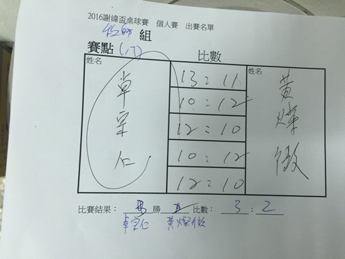 個人賽牧師長青組與青壯組合併,戰況激烈 23日的個人賽,採5戰3勝,雙淘汰制。8位女選手實力堅強,尤其是冠亞軍賽陷入激戰,由台中中會太平教會陳美芳遇上東榮教會國中二年級的宜藏舟小妹妹,總共打了三場才分出勝負。年近50歲的陳美芳說,年輕人的精力旺盛,第4局對手顯得有點情緒不穩,她才能靠經驗取勝,最後由陳美芳以3:1獲勝。從小學四年級起就參加謝緯盃團體賽的宜藏舟,這次透過孫瑞廷長老的邀請,全家一起參加比賽。每個禮拜有3、4次,宜藏舟都會和爸爸宜信潔一起練習,她坦言,這是她第一次參加個人賽,最後兄妹倆都得到亞軍。