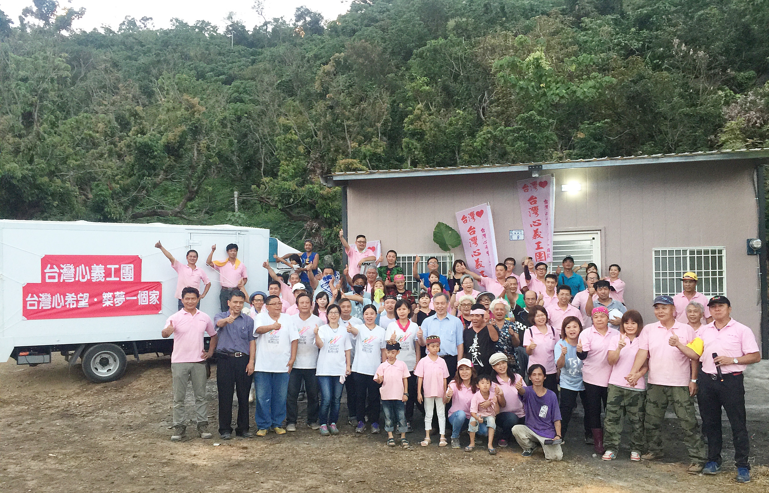來自全國各地的台灣心義工團在台東太麻里為阿公建造一個家(林佳靜攝) 7月尼伯特重創台東,至今4個多月,來自全國各地的台灣心義工團、點亮台灣團隊、TSP團隊、心愛在後花園、愛無限團隊、周世倫導演、台灣基督長老教會總會教社幹事林偉聯牧師及立委劉櫂豪等人,為了台灣弱勢的群體,發揮愛心、通力合作,經過二個禮拜,利用週末假日,約三天時間,神速般地完成台東富源阿嬷及太麻里阿公的家屋重建。尼伯特風災後第134天,志工團已修繕、重建完成超過七十戶家屋。 11月19日下午5時,台灣心義工團、點亮台灣、TSP團隊及愛無限團隊等70位愛心志工,在家屋重建專案管理人盧立偉的現場督工下,趕在太陽下山前完工,為台東縣太麻里鄉三和村的阿公舉行家屋重建入厝贈鑰儀式。 「一個案子結束,代表另一個新案子的開始。」台灣心義工團理事長尤瑞豐表示,案子結束了,心裡有份快樂的感覺,但又有一份淡淡的哀愁。快樂的是案主當天晚上就可以睡在舒適的家裡,哀愁的是又要跟合作夥伴TSP團隊分開,心裡有些傷感。這群愛心志工彼此間已產生濃厚的革命感情。 尤瑞豐說,「為了台灣這塊土地的弱勢團體,我們不會推辭。就像盧立偉講過一句話,各位身上都帶著天命。」下個週末,在竹東還有位阿嬤與失業的兒子在火災的灰燼中住了三個多月,非常需要幫忙,預計要在兩天內修繕完成,他鼓勵大家持續參與。 此次,台灣基督長老教會總會教社幹事林偉聯牧師,也邀請總幹事林芳仲牧師前來台東勘察家屋重建情況。林芳仲牧師看到現場有那麼多的愛心志工非常感動,他為大家加油打氣說,「我們一起把台灣的需要,看做是我們的需要;把台灣的事看做是我們的事。這就是台灣可以建立起來最要緊的力量!」