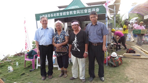 台灣基督長老教會總會總幹事林芳仲牧師(左一)、教社幹事林偉聯牧師(右一), 前往台東太麻里阿公的家祝賀(林佳靜攝)