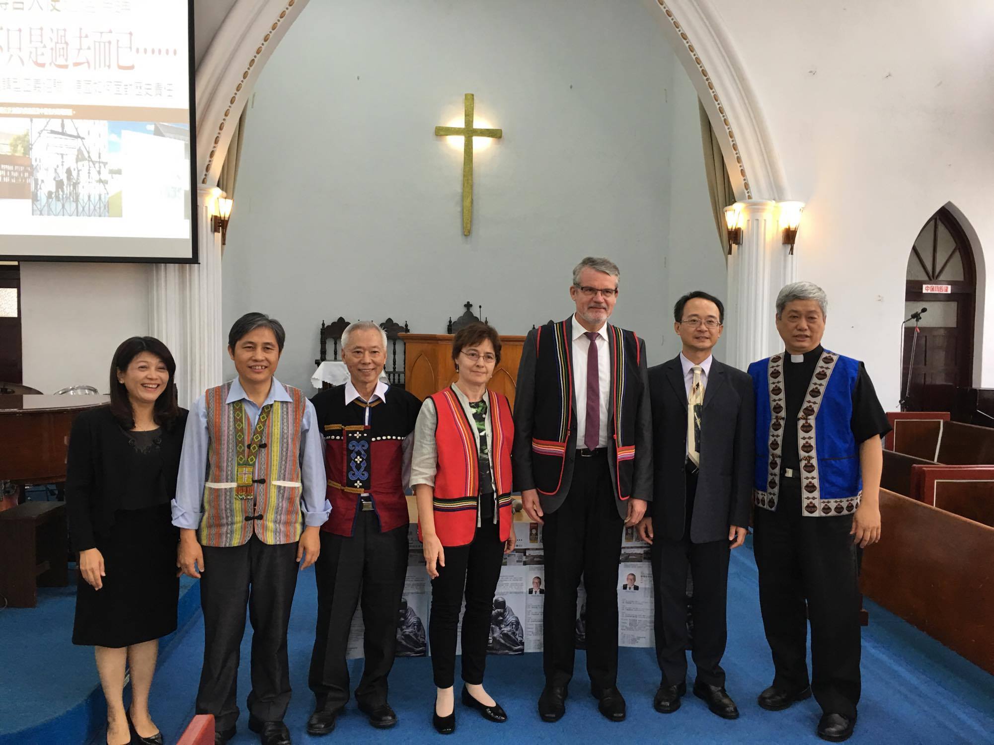 歐博哲大使夫婦與主辦單位及回應人前玉山神學院教授陳南州牧師、 台灣基督長老教會原住民教社幹事歐蜜‧偉浪牧師合影(總會教社提供) 11月19日上午10時,台灣基督長老教會總會教會與社會委員會邀請德國在台協會處長歐博哲(Martin Eberts),到花蓮港教會分享「德國轉型正義經驗」。為此,東部中會傳道部決議參與協辦,並做為北區長執訓練會內容,其他還有花東區的原住民牧長及東華大學學生約155位前往聆聽。 演講前,歐博哲大使特別感謝長老教會對他們夫婦熱誠的接待,並表示,台灣是他這三十年來的外交官生涯中,最讓他感動的地方。花蓮港教會林維道牧師及翻譯者吳信如社長特別陪同大使夫婦前往馬太鞍教會、鶴岡教會、太巴塱天主堂、姬望教會及太魯閣國家公園等地參訪,讓他們能看見最真實的台灣。歐博哲說,從前他以為PCT最有貢獻的是台灣民主化,想不到還有這麼多面向,真是個令人「感動」的教會!歡迎宴中,他有機會碰到立委蕭美琴,還建議她可以邀請德國國會議員到台灣參訪,將台灣的風土民情介紹給國際友人。